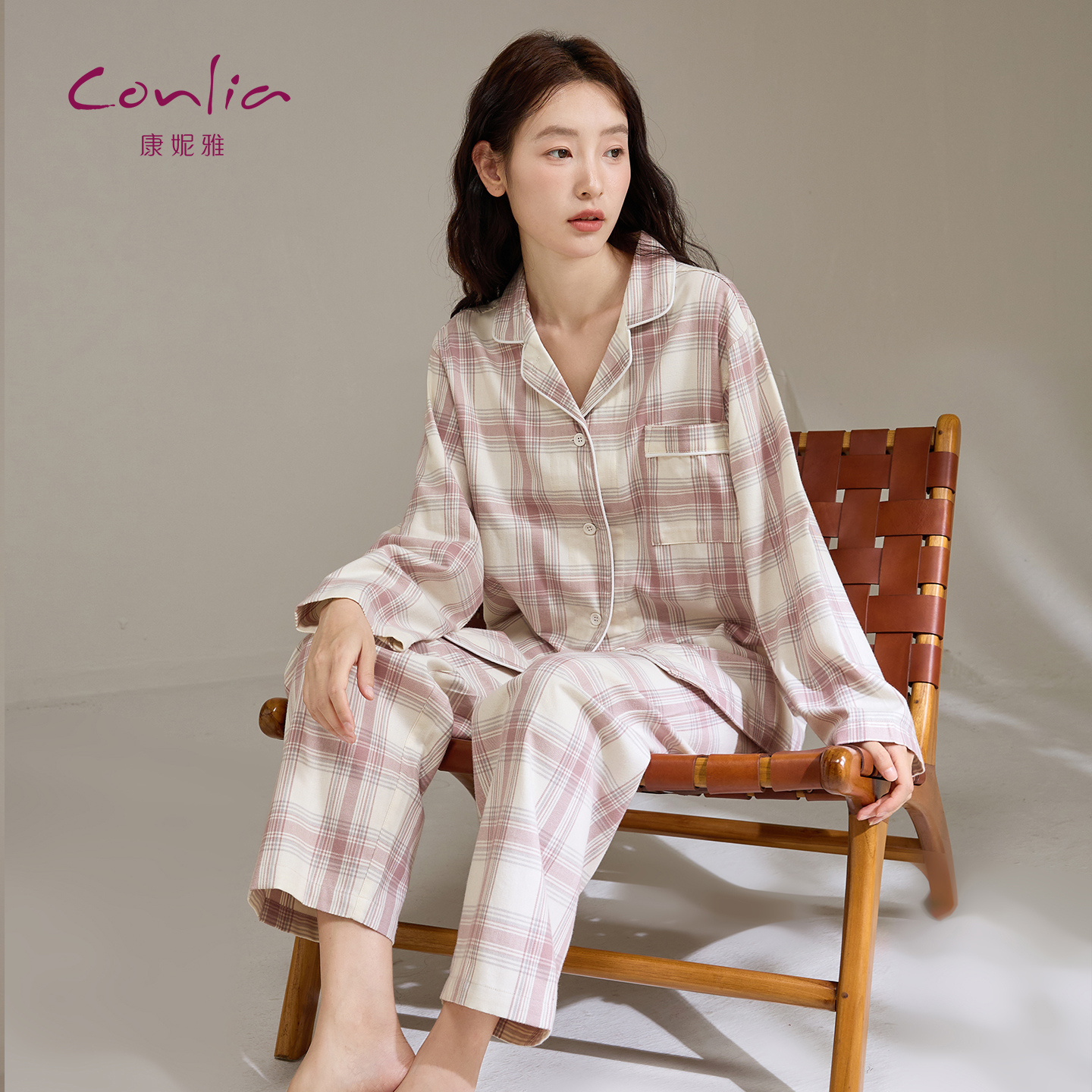 棉纱磨毛保暖全棉家居服格子可外穿 长裤 康妮雅睡衣女秋款 纯棉长袖