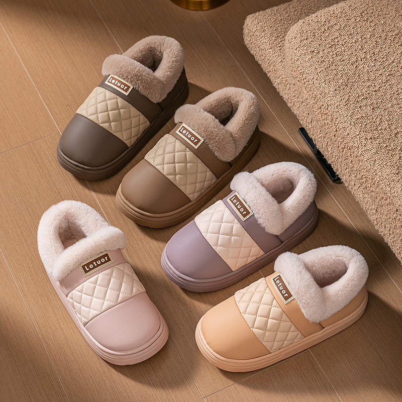 防水皮面棉拖鞋 防滑男 包跟女士秋冬室内居家保暖外穿厚底情侣棉鞋
