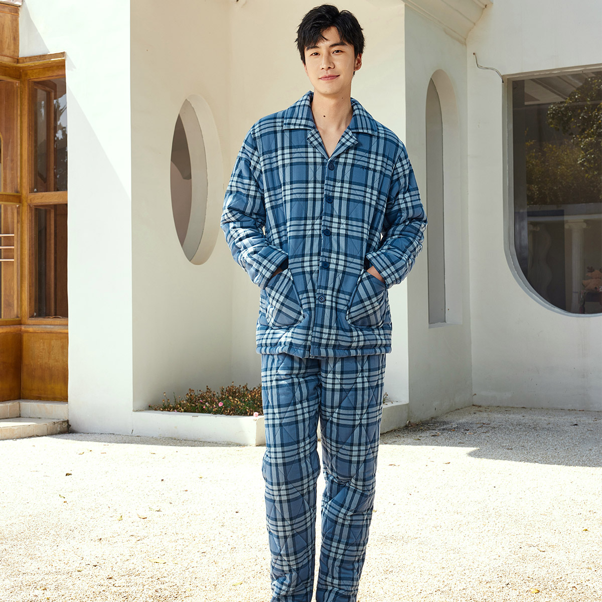 睡衣春秋季 可外穿家居服秋冬套装 华夫格纯棉长袖 大码 四季 猫人男士