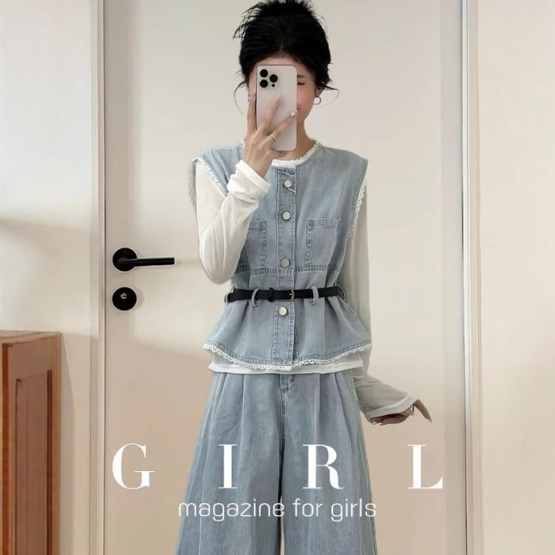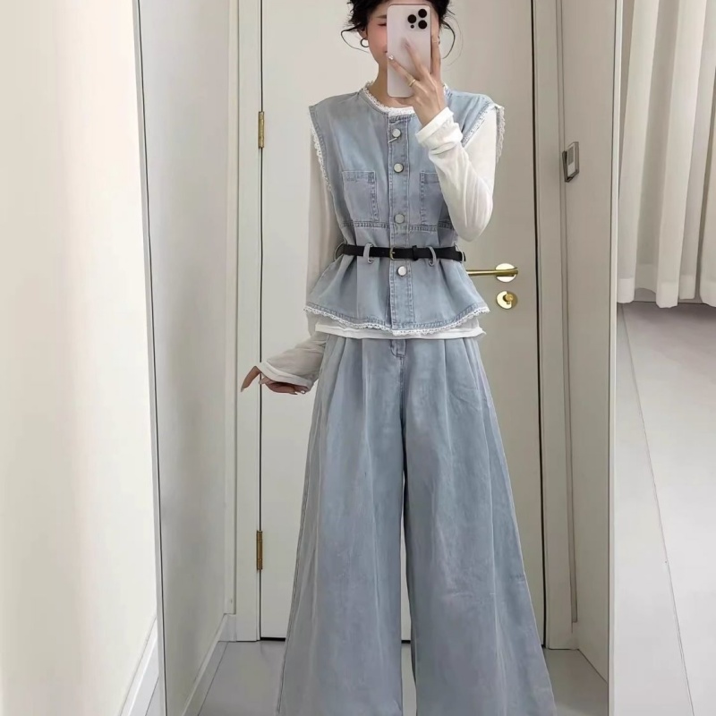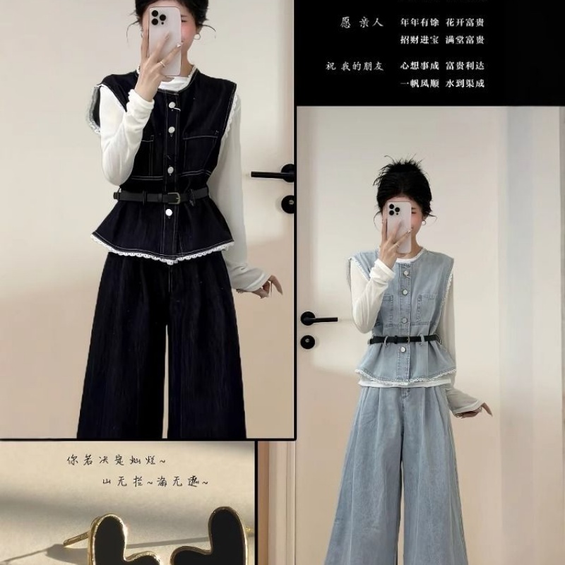 氛围感时尚 设计感减龄牛仔阔腿裤 新款 女2025秋季 气质三件套 套装