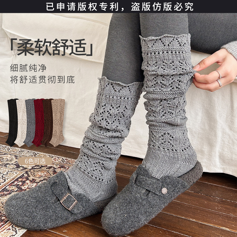 6%羊毛袜子女小腿袜秋冬款 镂空复古堆堆袜套女士百搭潮流长筒袜女