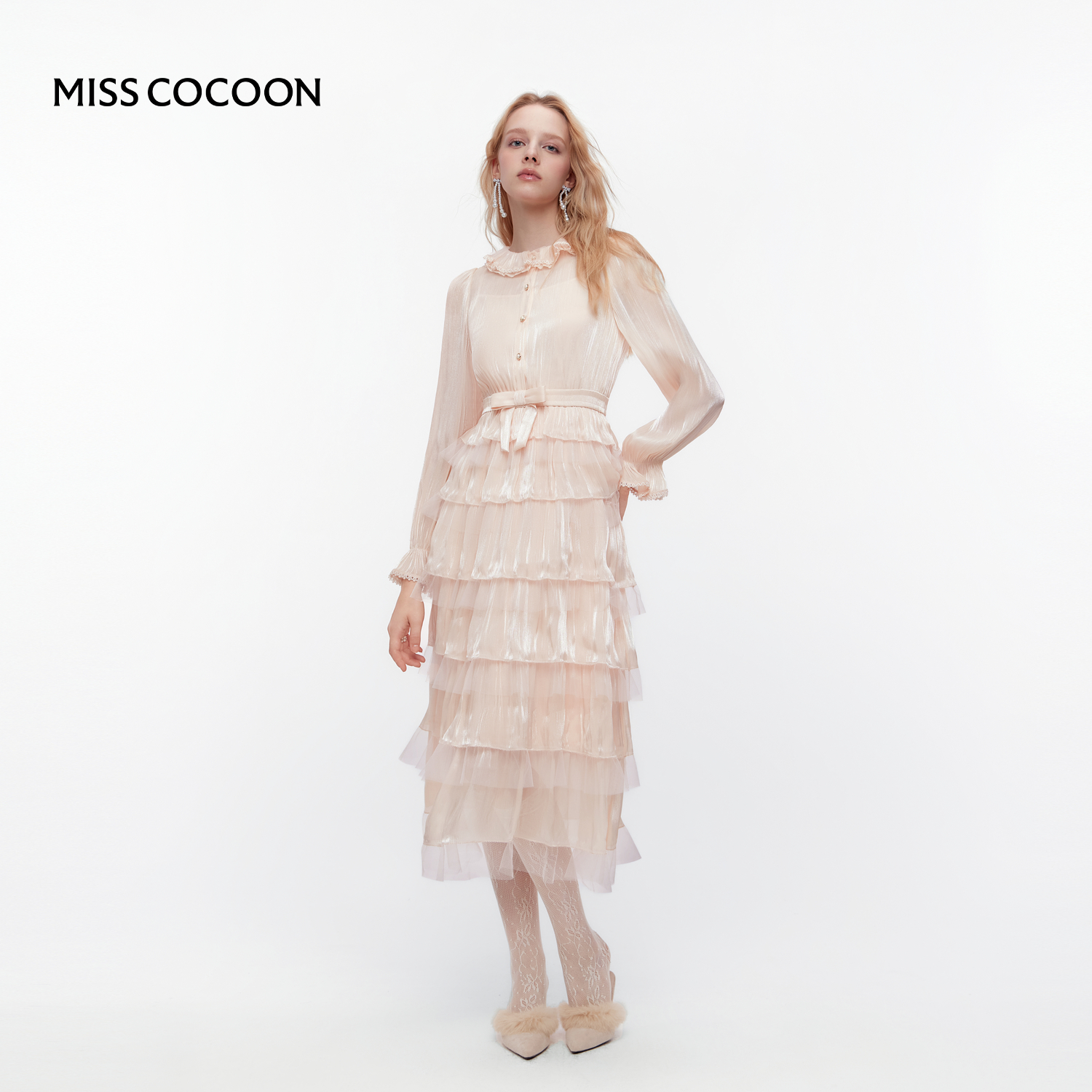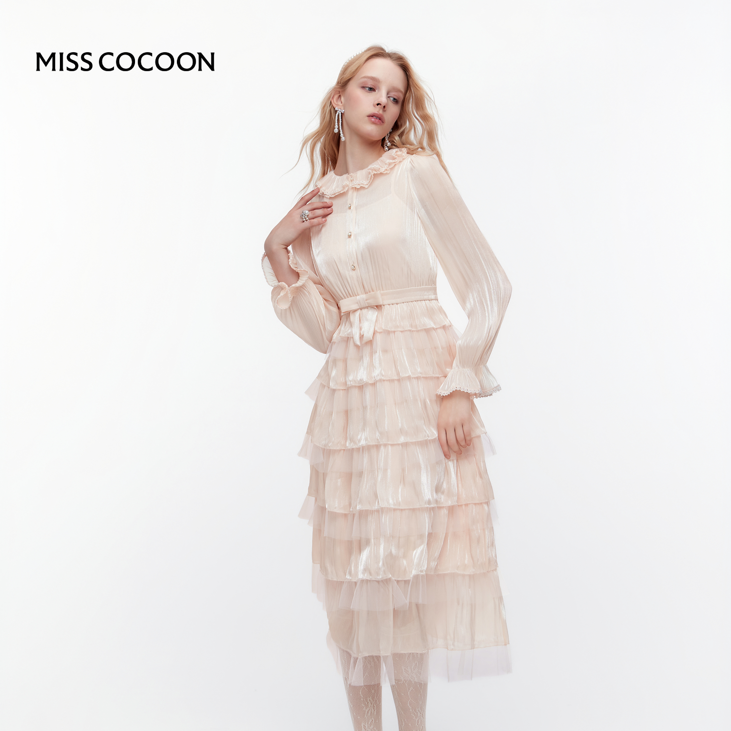 复古收腰显瘦A字中长裙子 新款 紫涵蕾丝花边圆领长袖 连衣裙女秋季