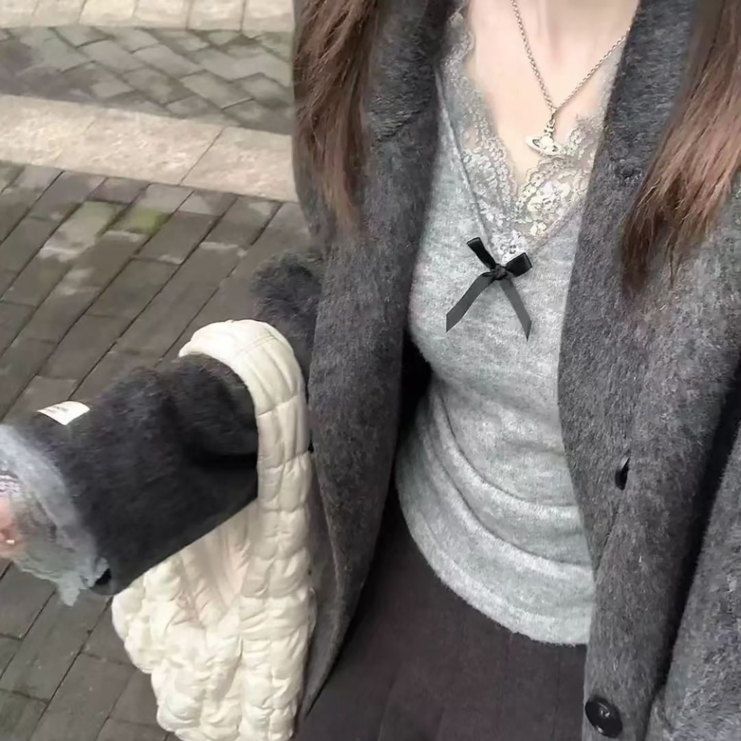 磨毛加绒上衣 内搭打底衫 纯欲风蝴蝶结蕾丝拼接长袖 T恤女秋冬修身