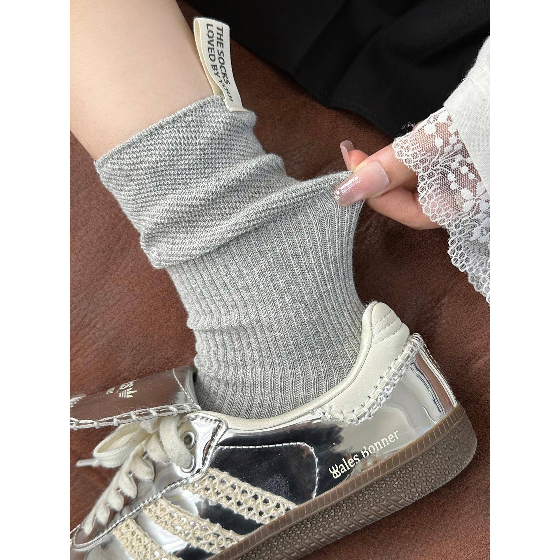 白色堆堆袜子女纯棉中筒袜秋季 长袜 灰色无骨慵懒后跟布标配勃肯鞋