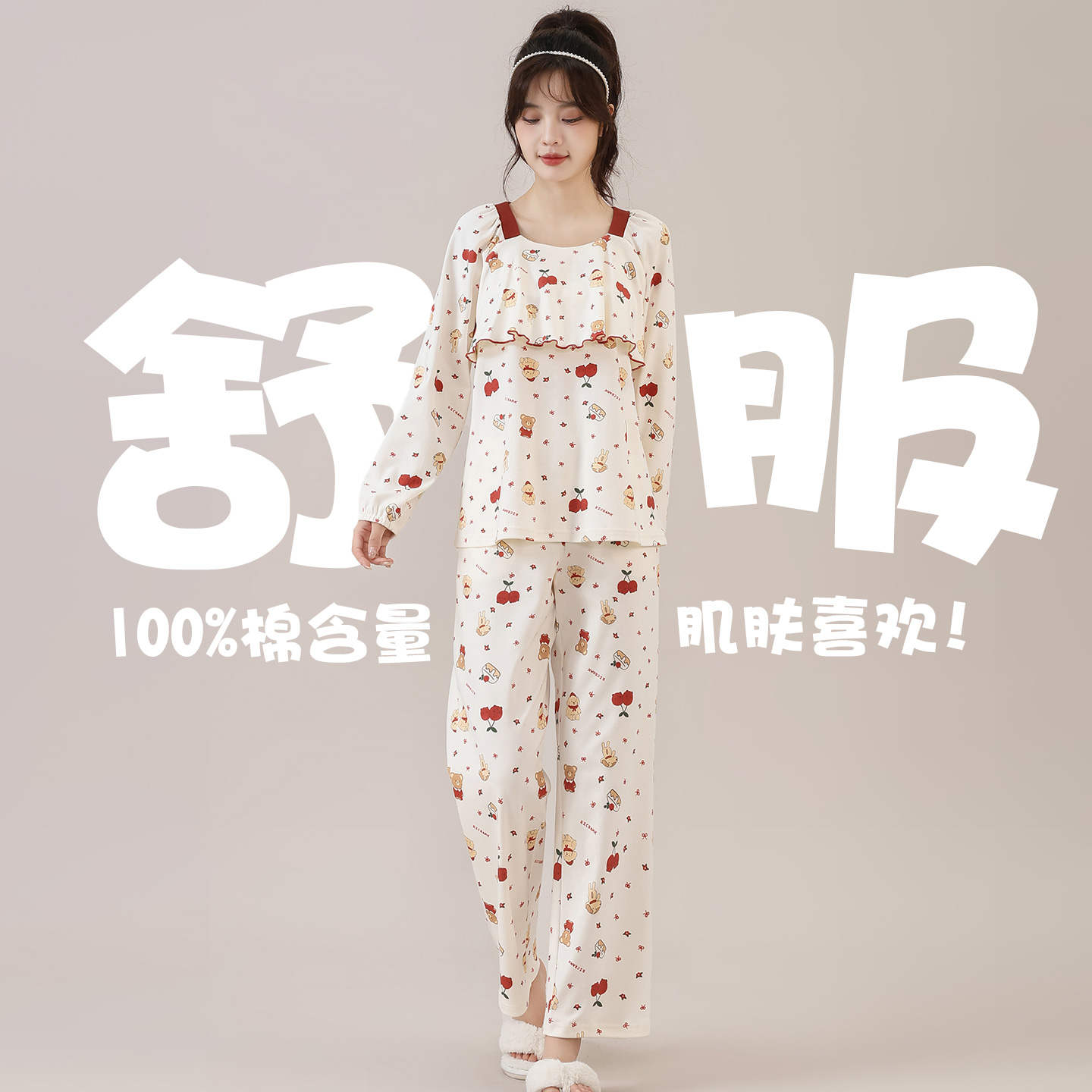 家居服套装 睡衣女纯棉春秋长袖 甜美可爱前胸双层防凸点可外穿秋季