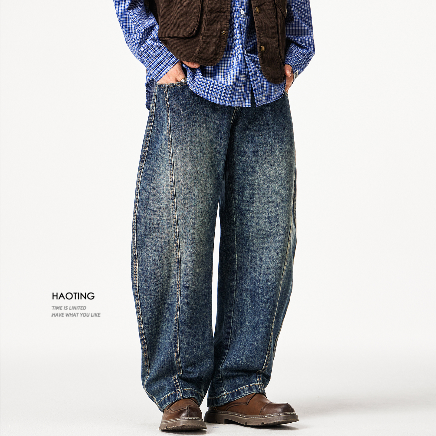 女 磨毛茧型香蕉阔腿牛仔裤 太平鸟本布腰带弯刀牛仔裤 2025秋冬新款