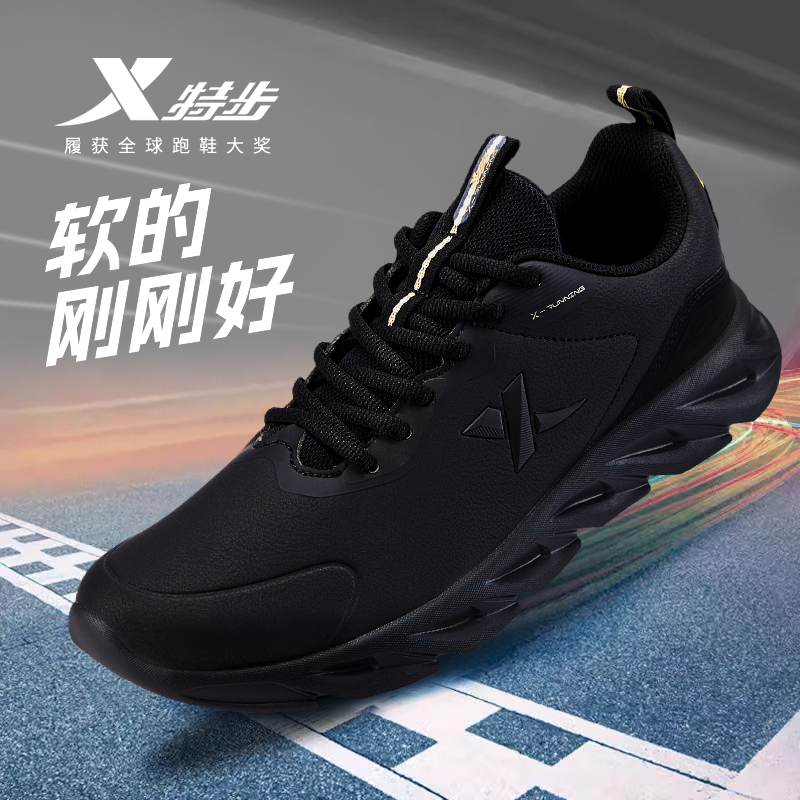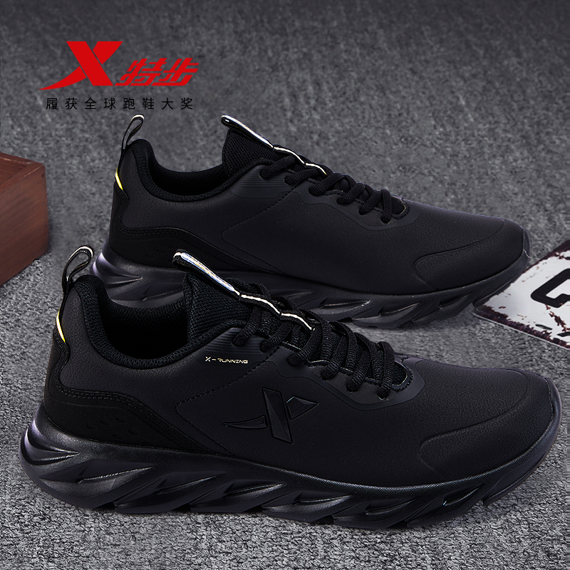 黑色皮面防泼水轻便减震网面跑步鞋 男秋冬新款 子 运动鞋 特步羽逸