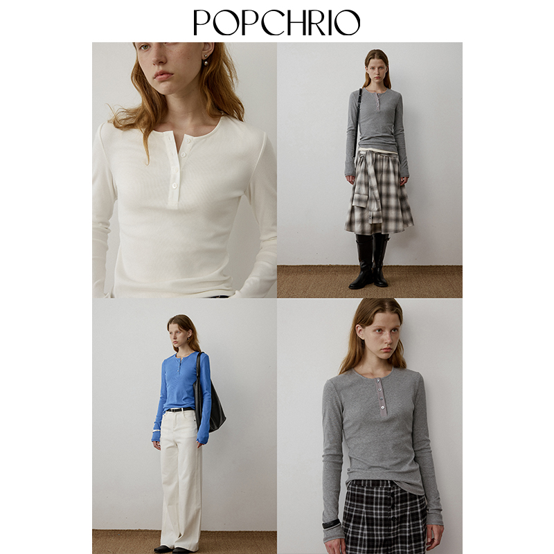 经典 T恤内搭修身 亨利领针织打底衫 长袖 上衣 法式 POPCHRIO欧可芮