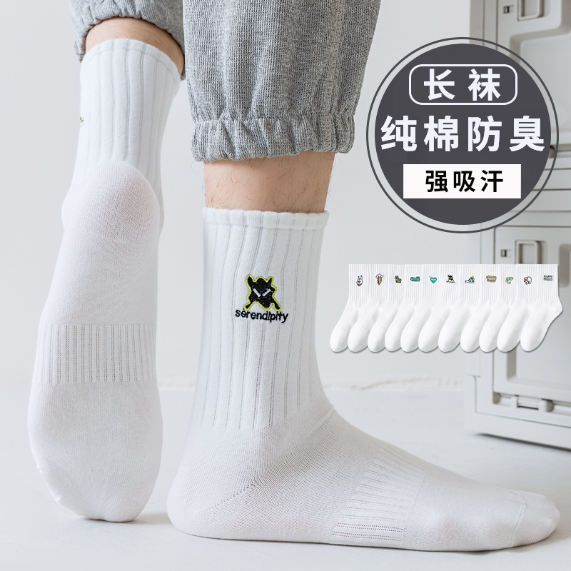 7A抗菌袜子男生纯棉100%全棉防臭运动袜白色高中生军训中筒袜男孩