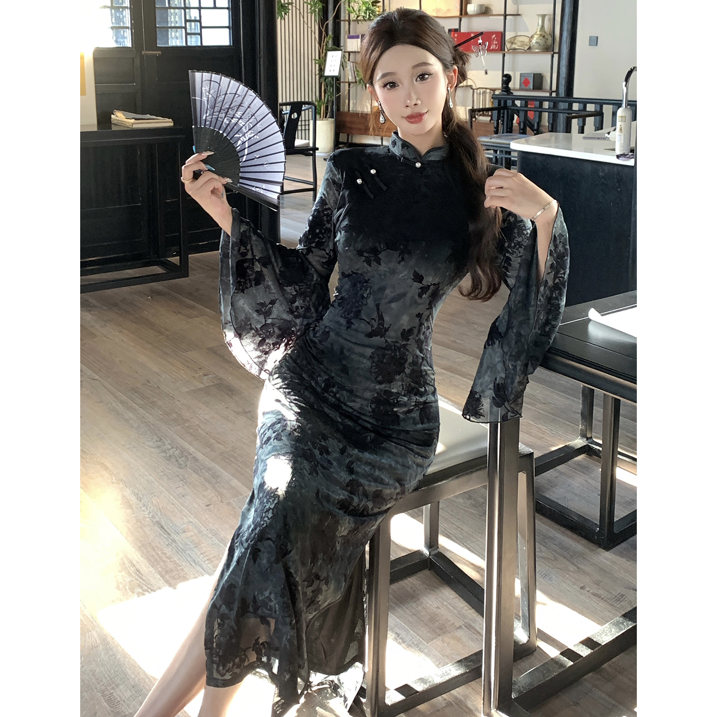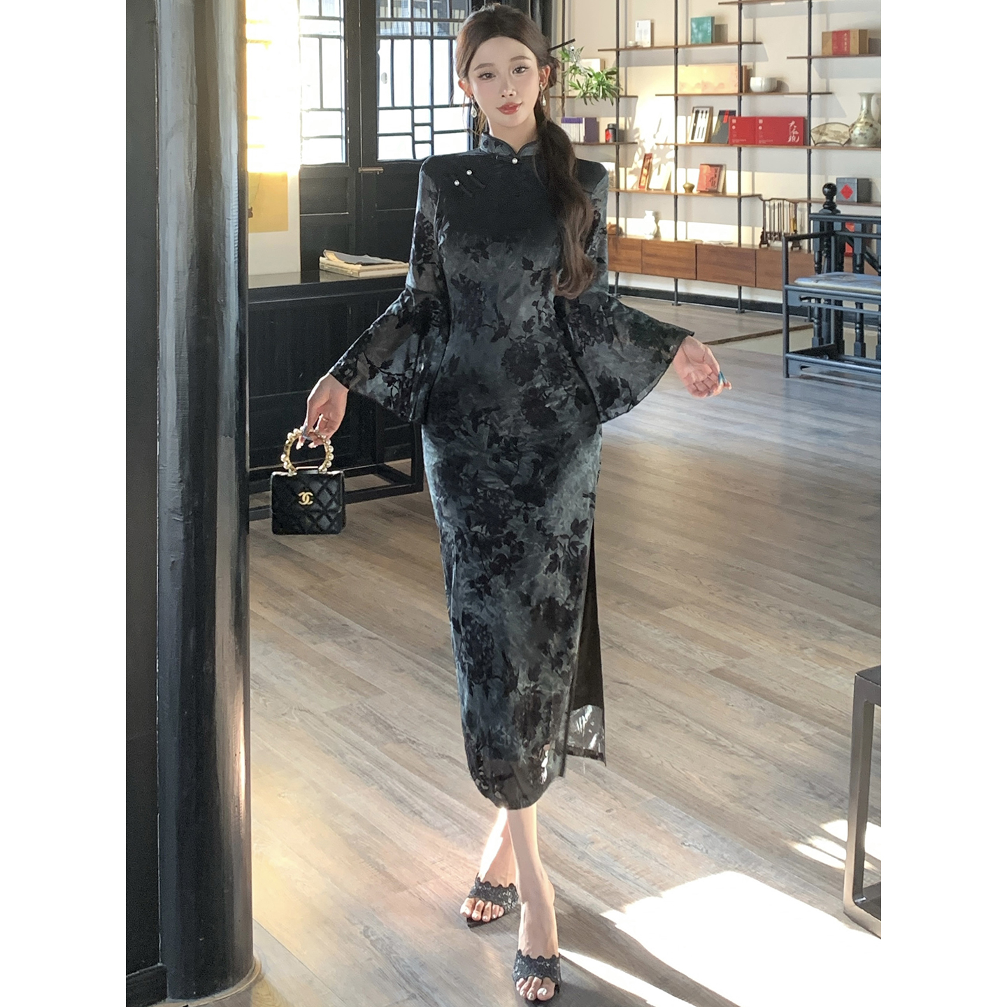 秋冬连衣裙旗袍开叉新中式 锦绒绣花 丝绒黑色长裙 潘泪滢 JKJS
