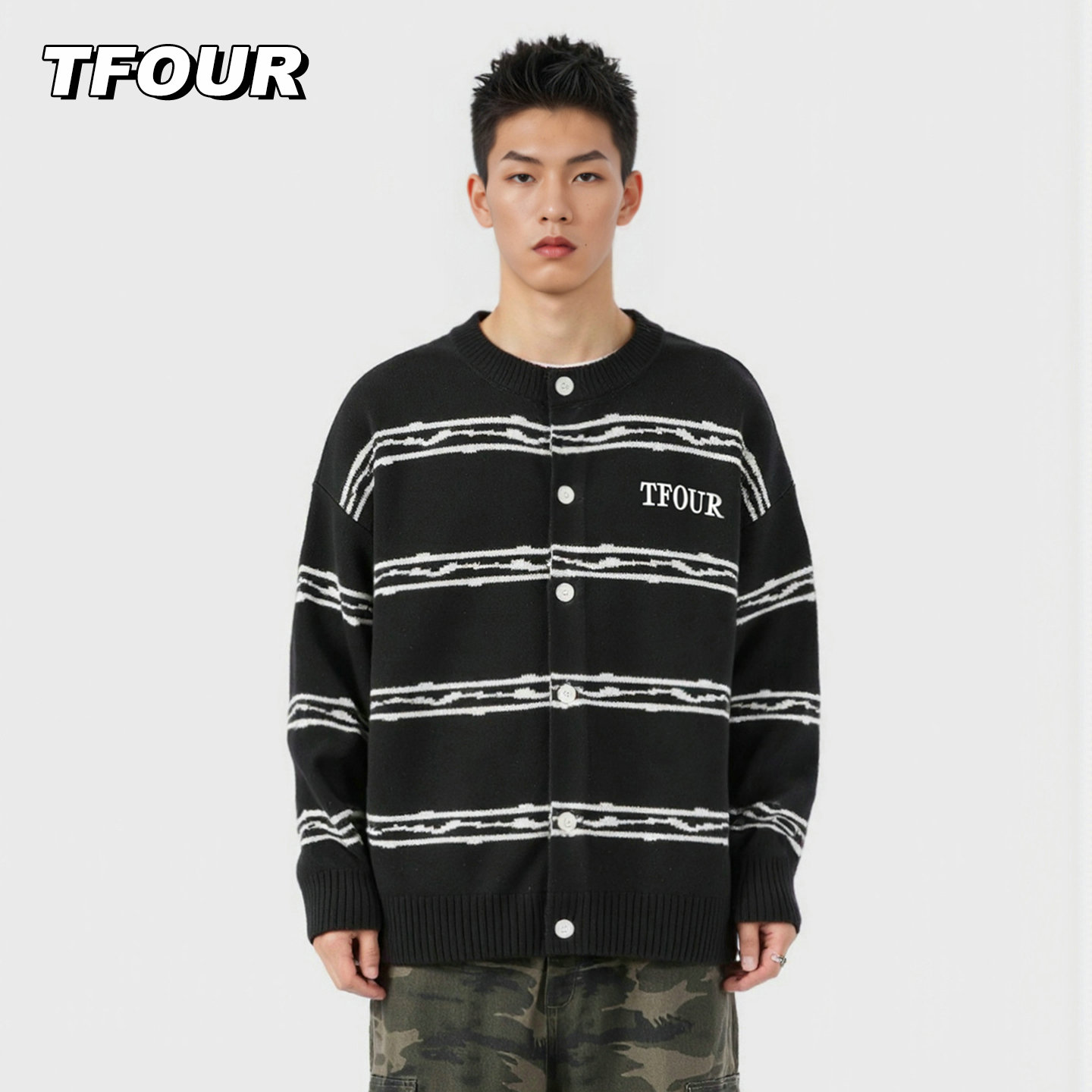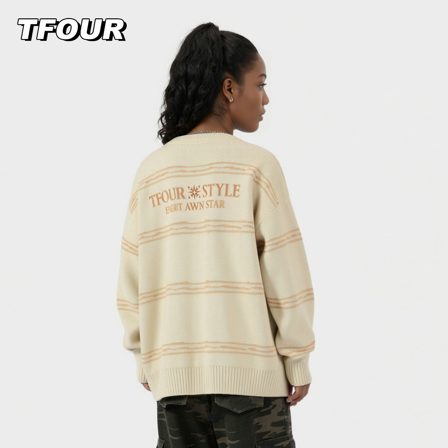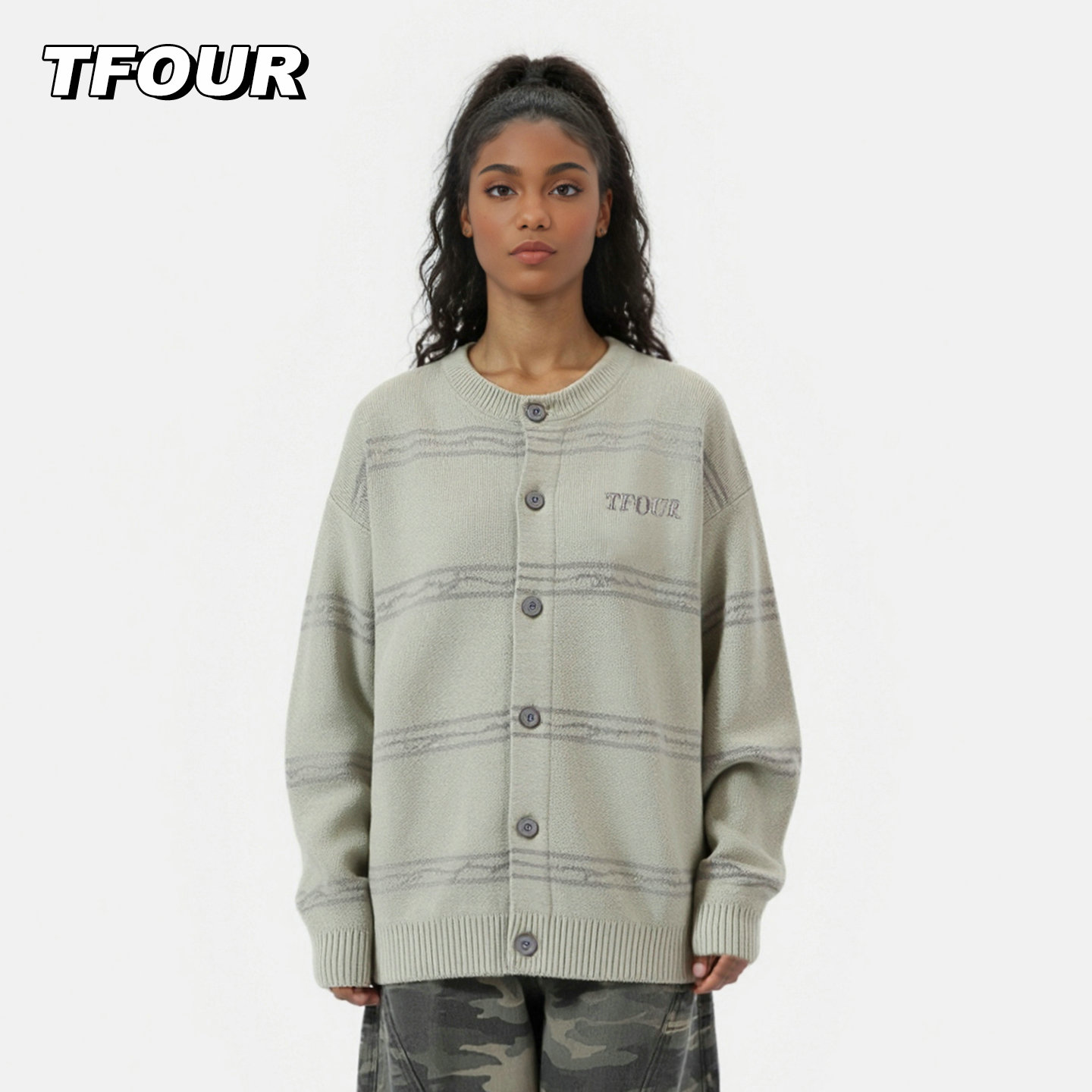 潮牌美式 男女秋季 宽松条纹毛衣外套 慵懒松弛感圆领针织开衫 TFOUR