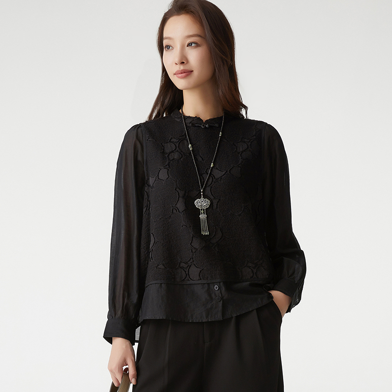 女士拉谷谷春秋长袖 木耳边白衬衫 LAGOGO法式 立领上衣 抗菌抗皱