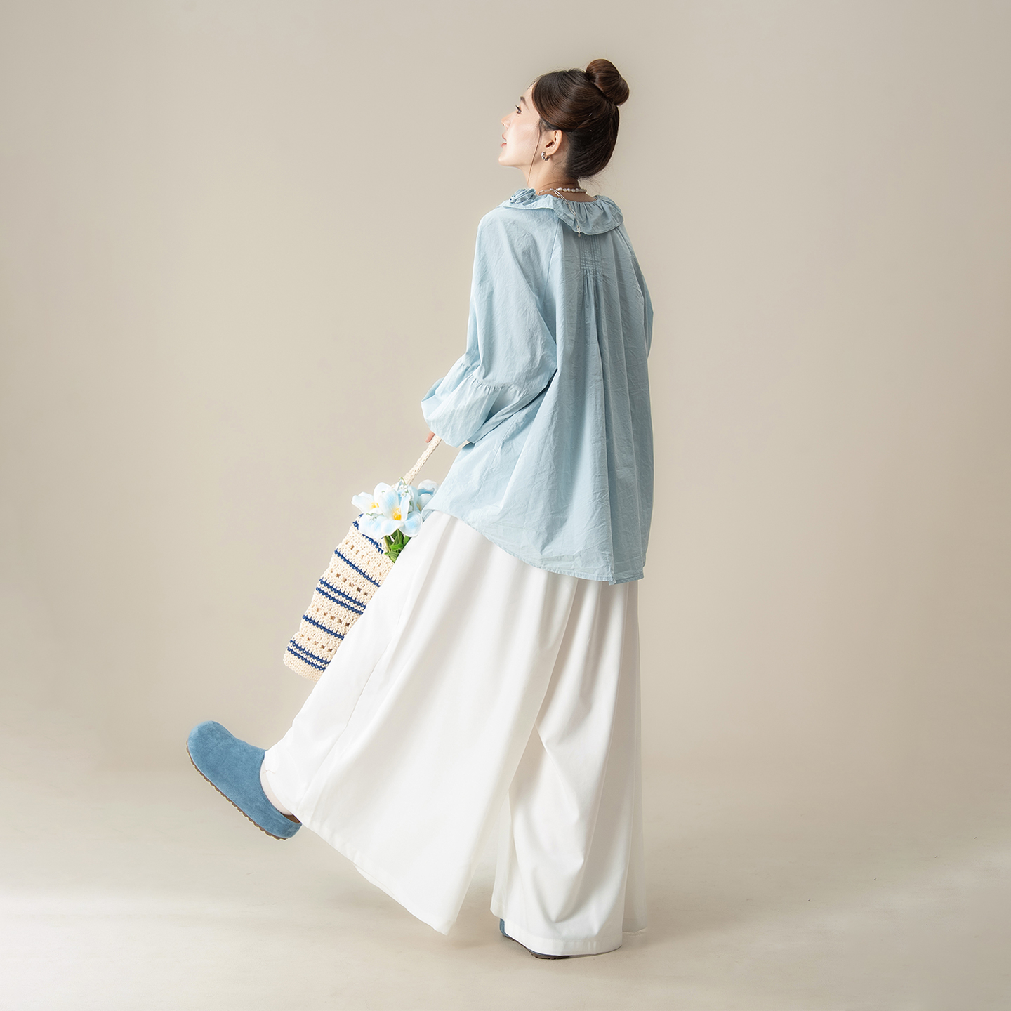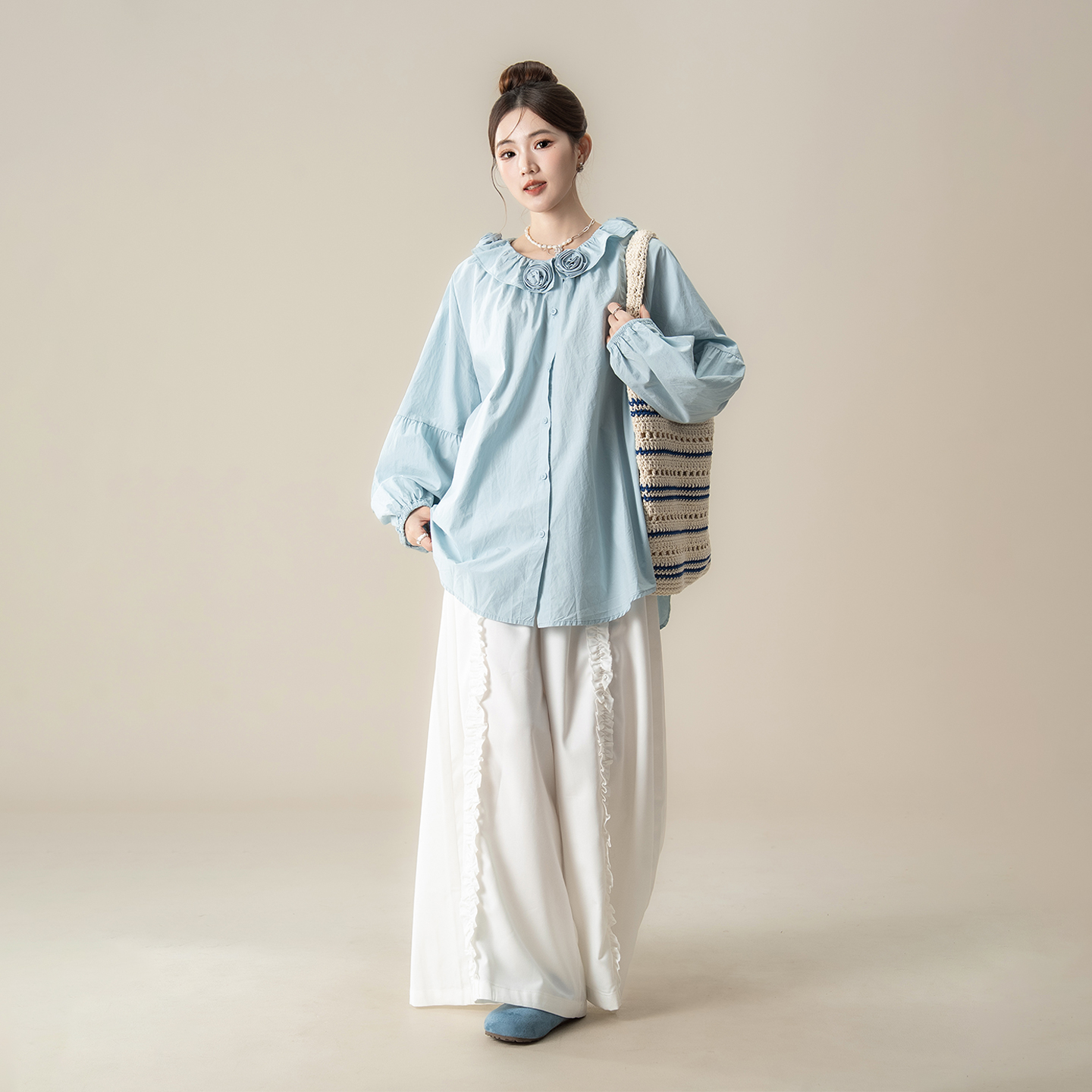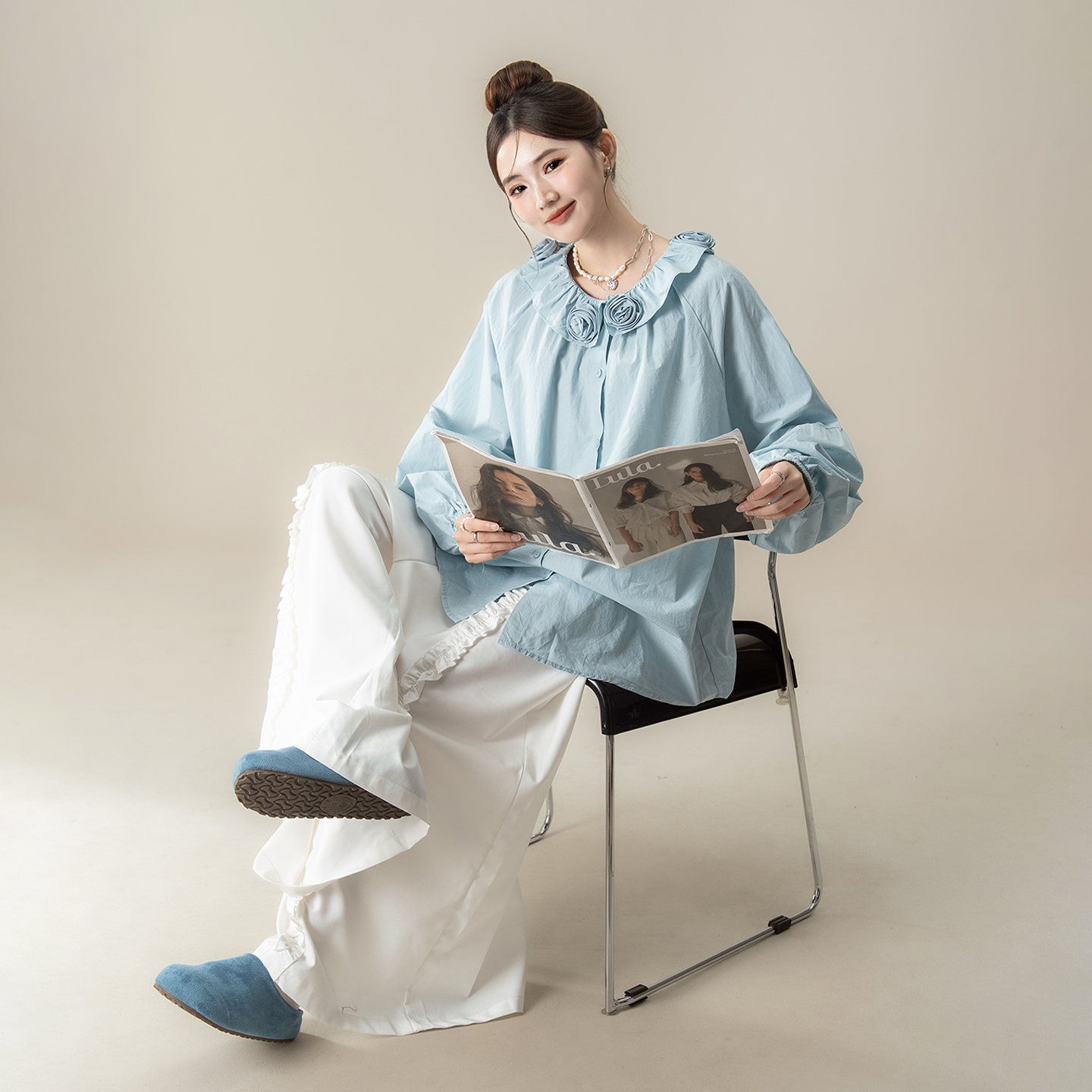 新款 女秋季 慵懒风宽松显瘦上衣 衬衫 浅蓝色森系甜美减龄花边领长袖