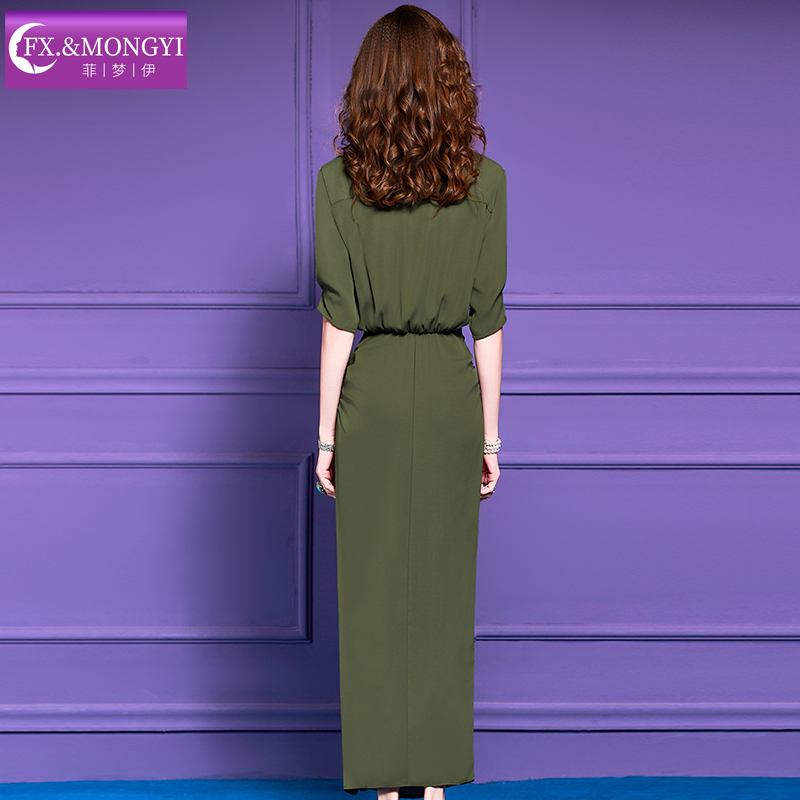 极简风设计感褶皱开叉气质长裙子 法式 菲梦伊绿色衬衫 连衣裙女秋季
