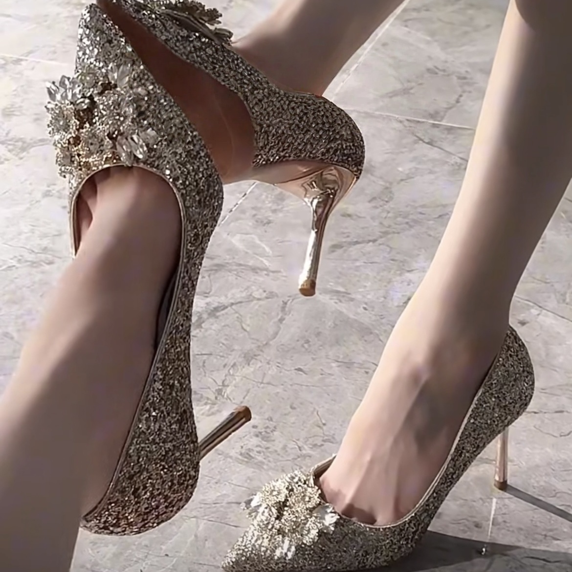 金色水晶不累脚单鞋 女主婚纱秀禾两穿新高跟鞋 细跟水钻 婚鞋 法式