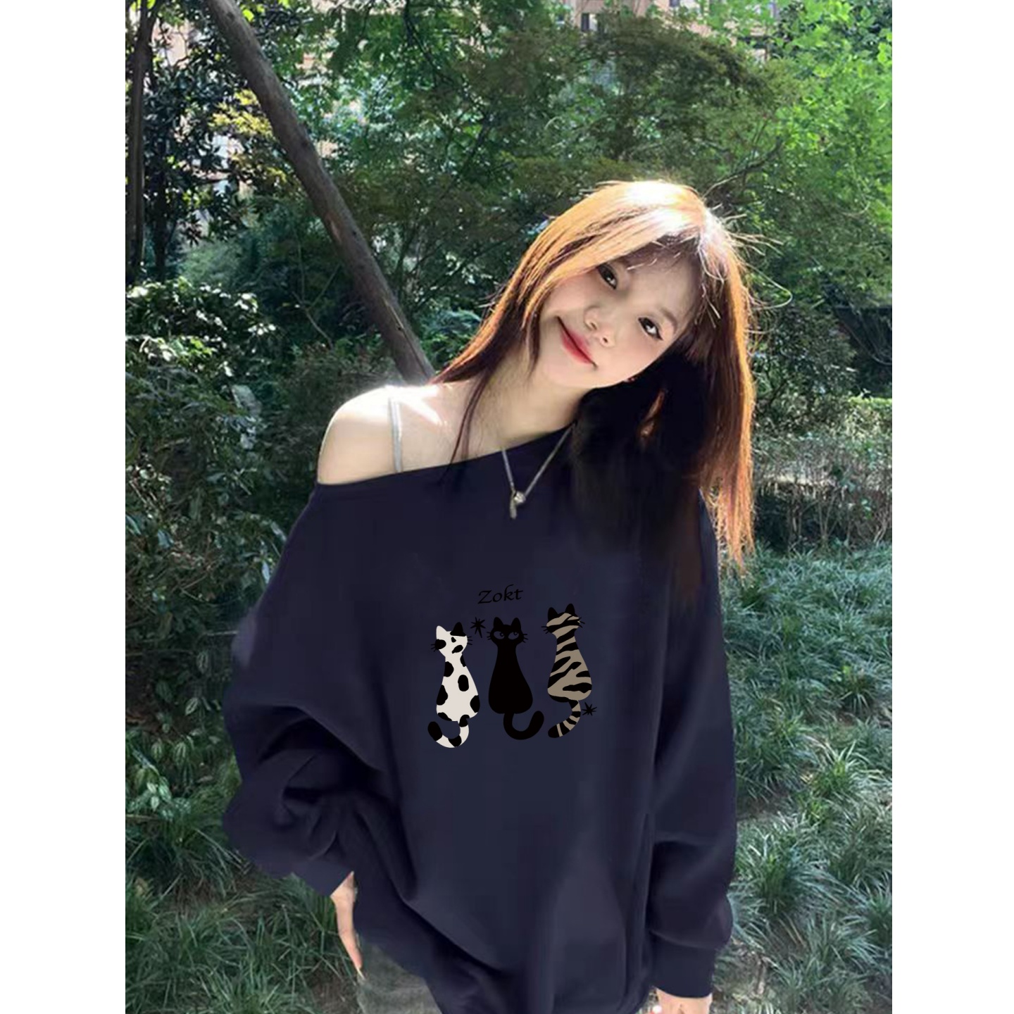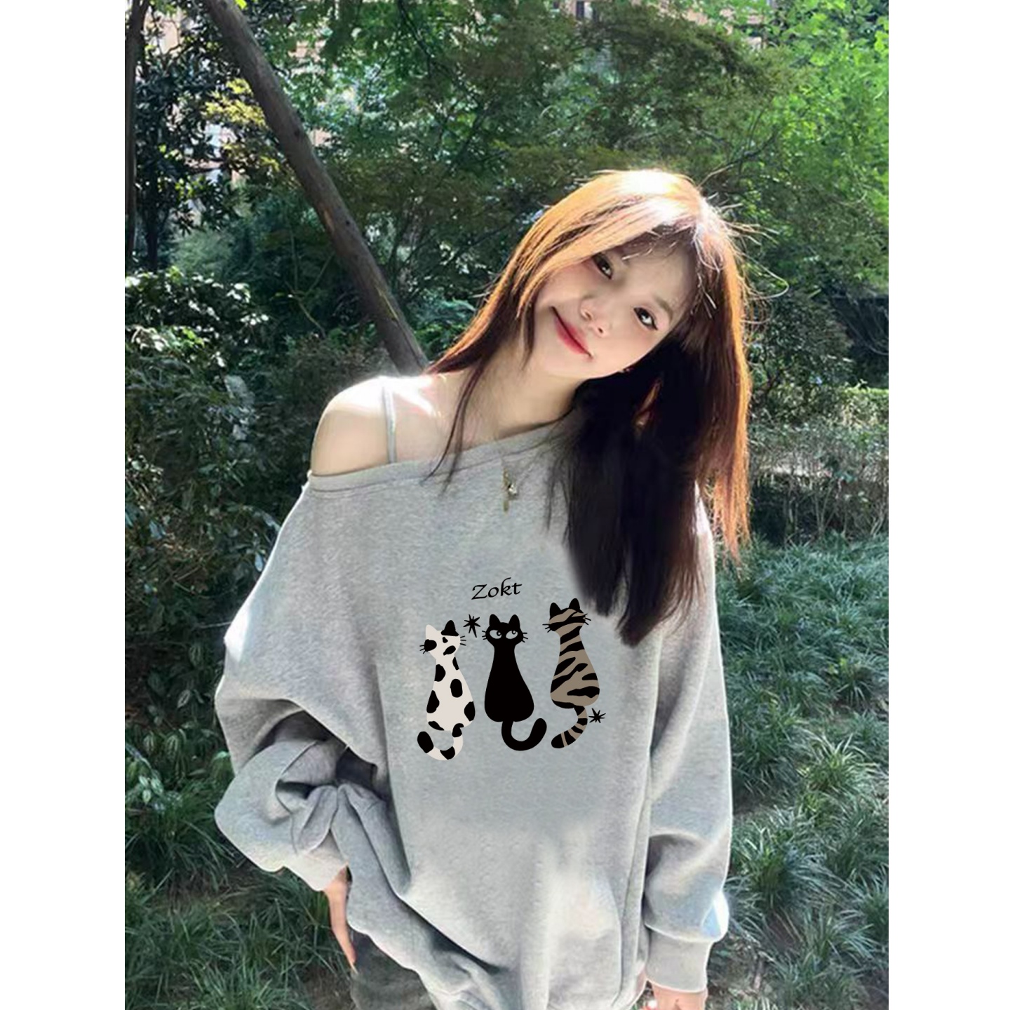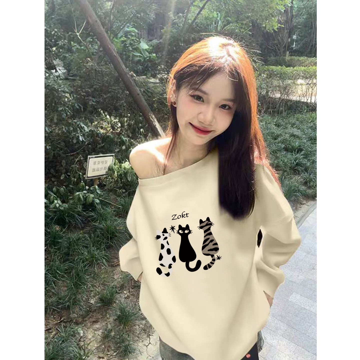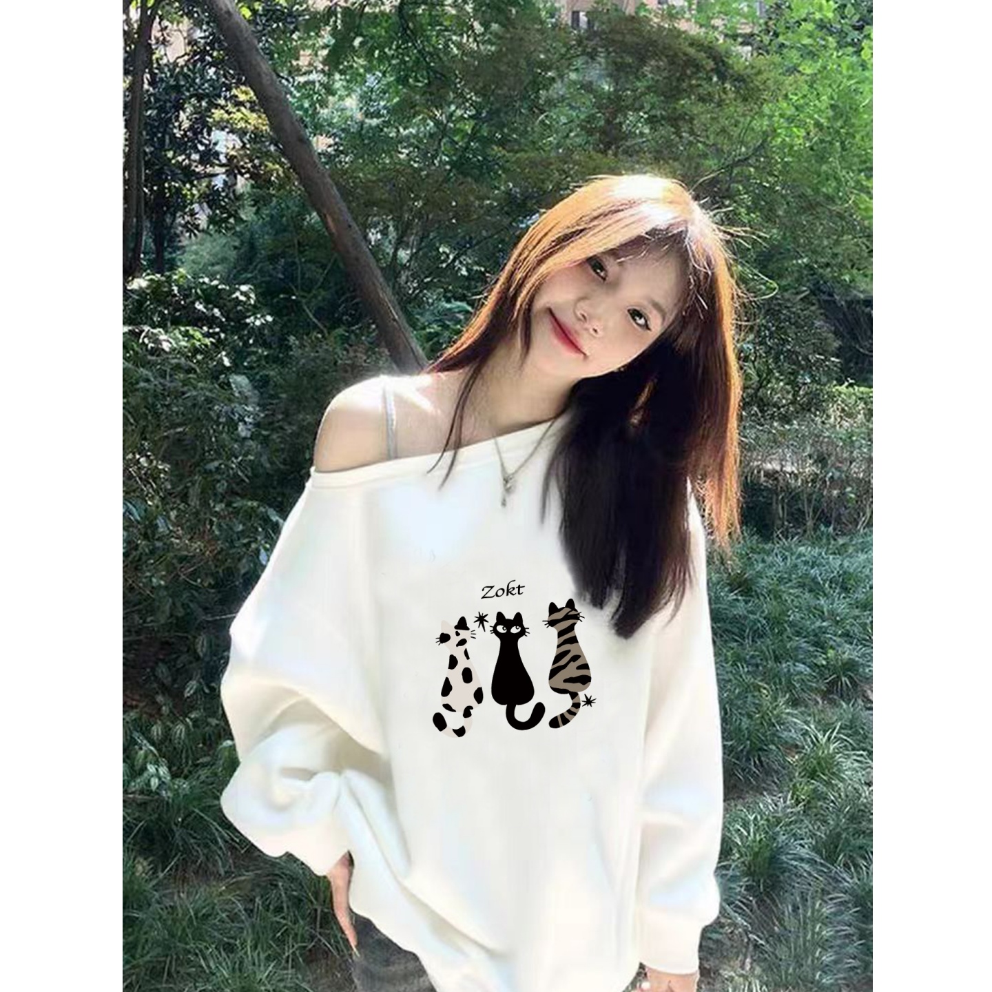 猫咪印花宽松套头休闲斜领露肩卫衣女2025秋季 小众粉色上衣潮 美式