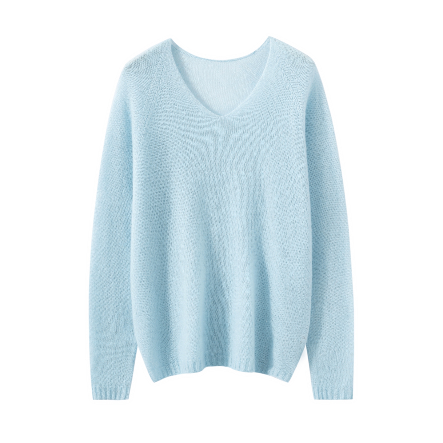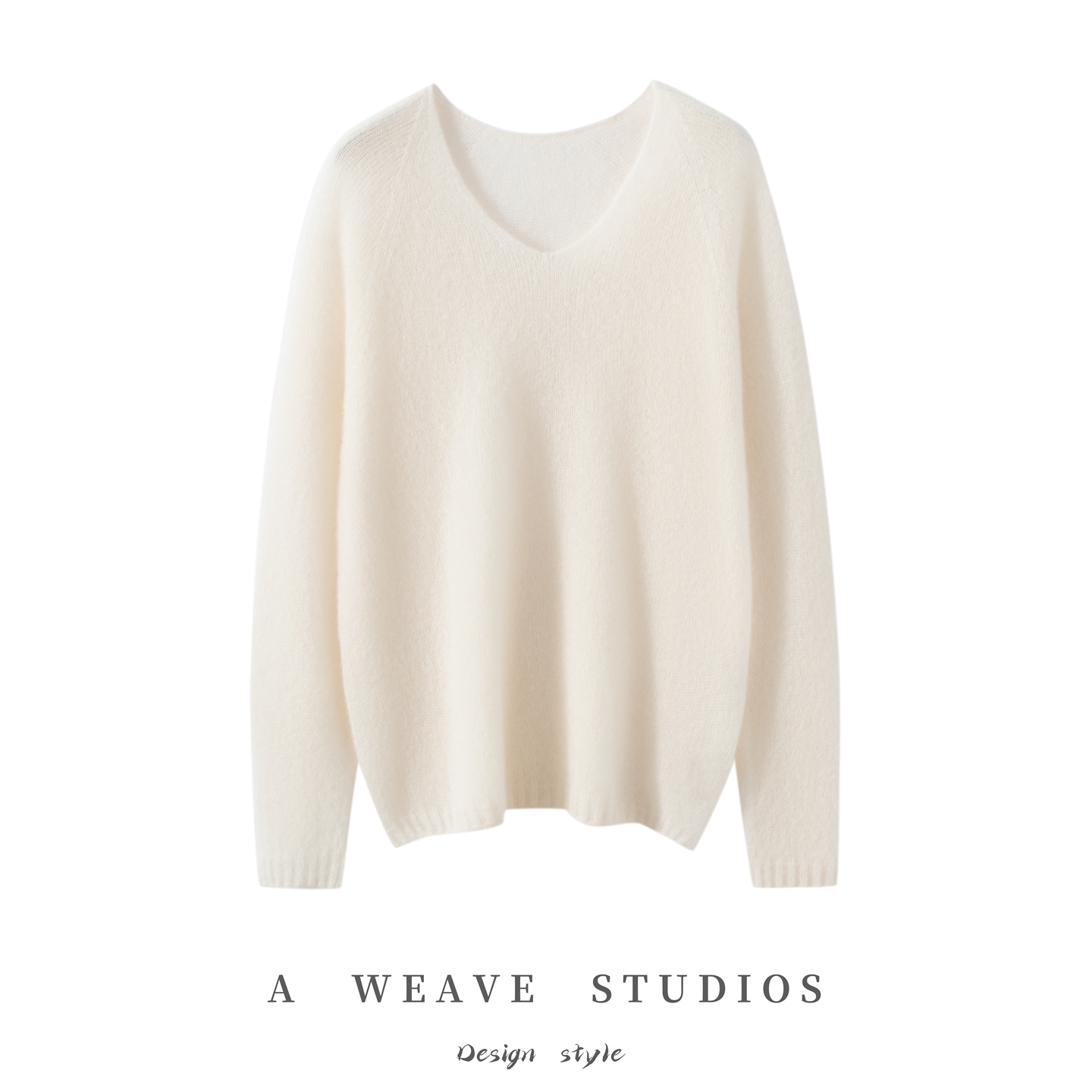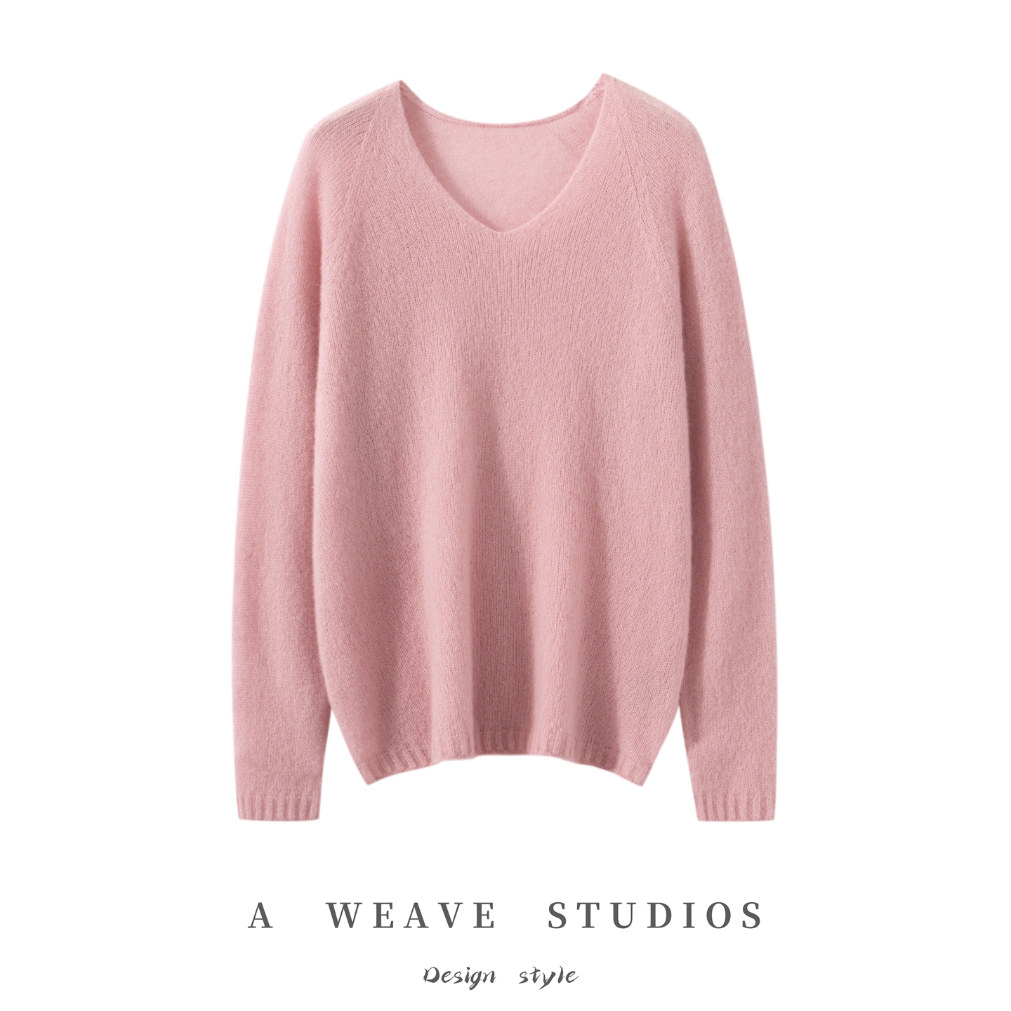 套头无缝打底衫 秋冬季 长袖 女宽松慵懒毛衣针织衫 V领蚕丝山羊绒衫