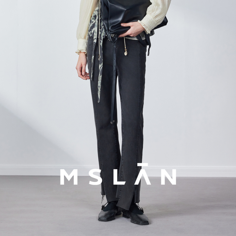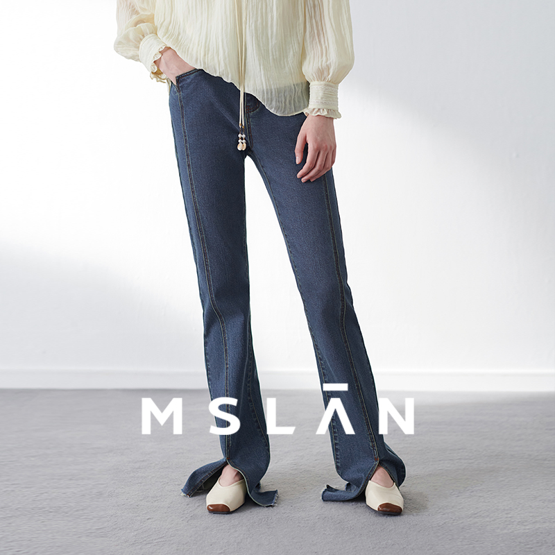 MSLAN25秋毛边开叉弹力显瘦不规则小个子时髦微喇牛仔裤 女
