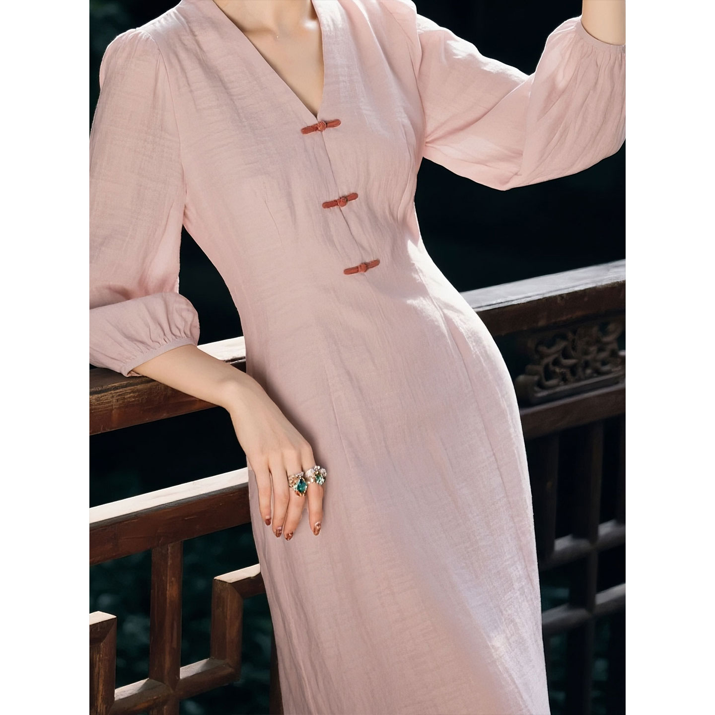 改良旗袍长款 新中式 国风V领长袖 新款 裙子 粉色连衣裙女2025年秋季