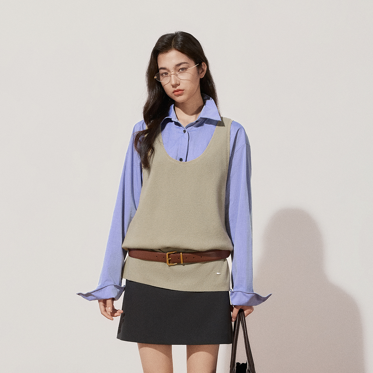 OCHIRLY欧时力 100%澳大利亚美丽诺羊毛U领毛织背心2025秋冬新品