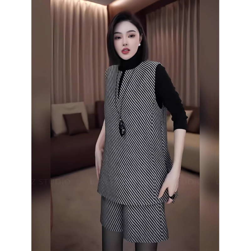 女装 两件套胖mm遮肉显瘦套装 秋季 宽松气质马甲松紧腰短裤 新款 大码