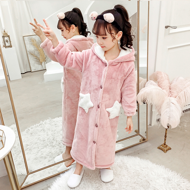 儿童浴袍珊瑚绒睡袍法兰绒秋冬季 星星女童保暖小孩睡衣 双层加厚款