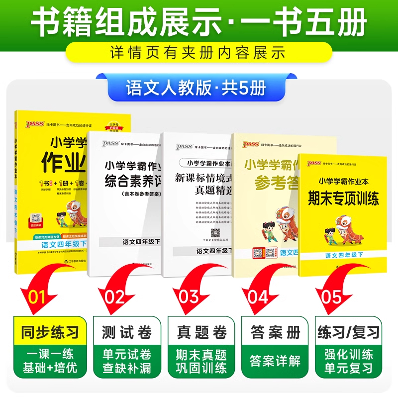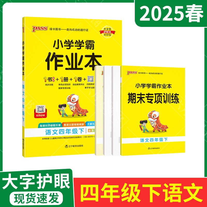 2025春适用pass绿卡小学学霸作业本四年级下册语文统编版 期中末试卷课 人教全彩手绘4年级下同高效预习名师讲解全解读四下达标单元