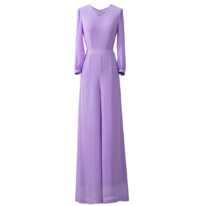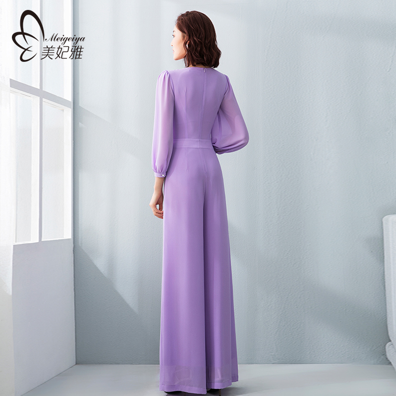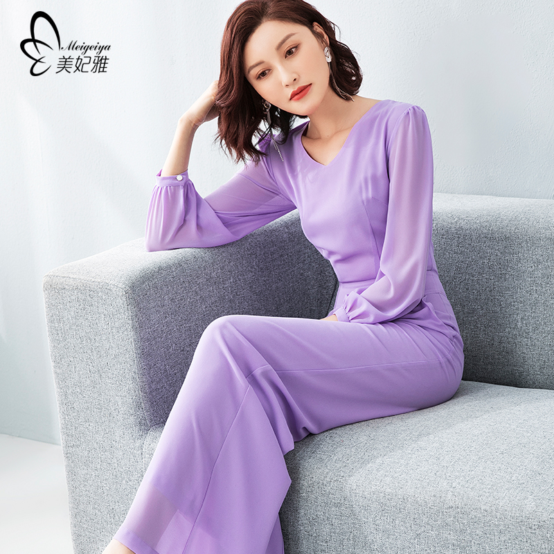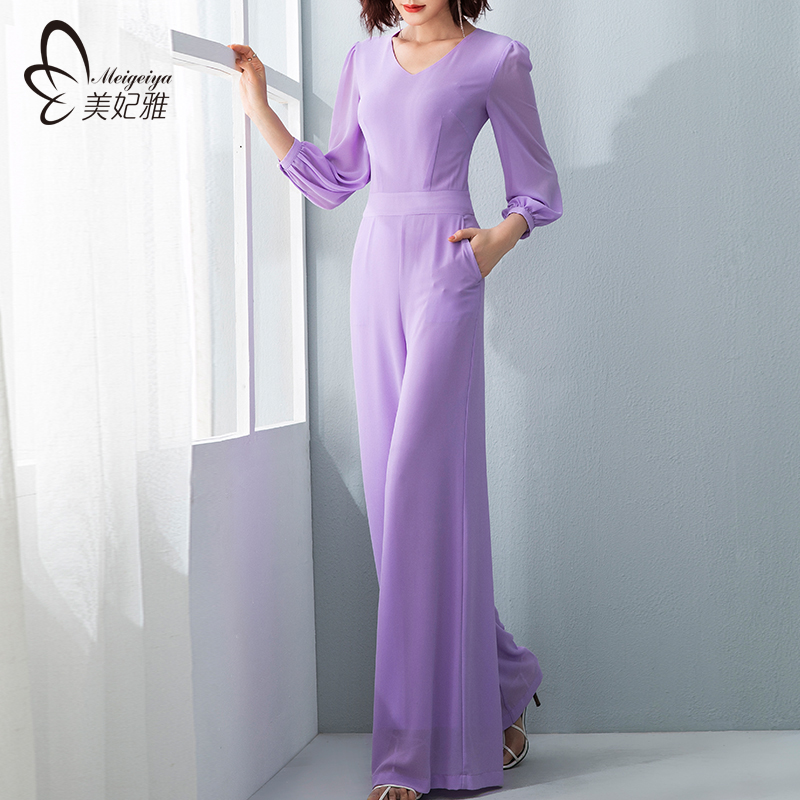 新款 阔腿裤 套装 紫色V领雪纺连体裤 连衣连身裤 秋季 气质长袖 女长裤