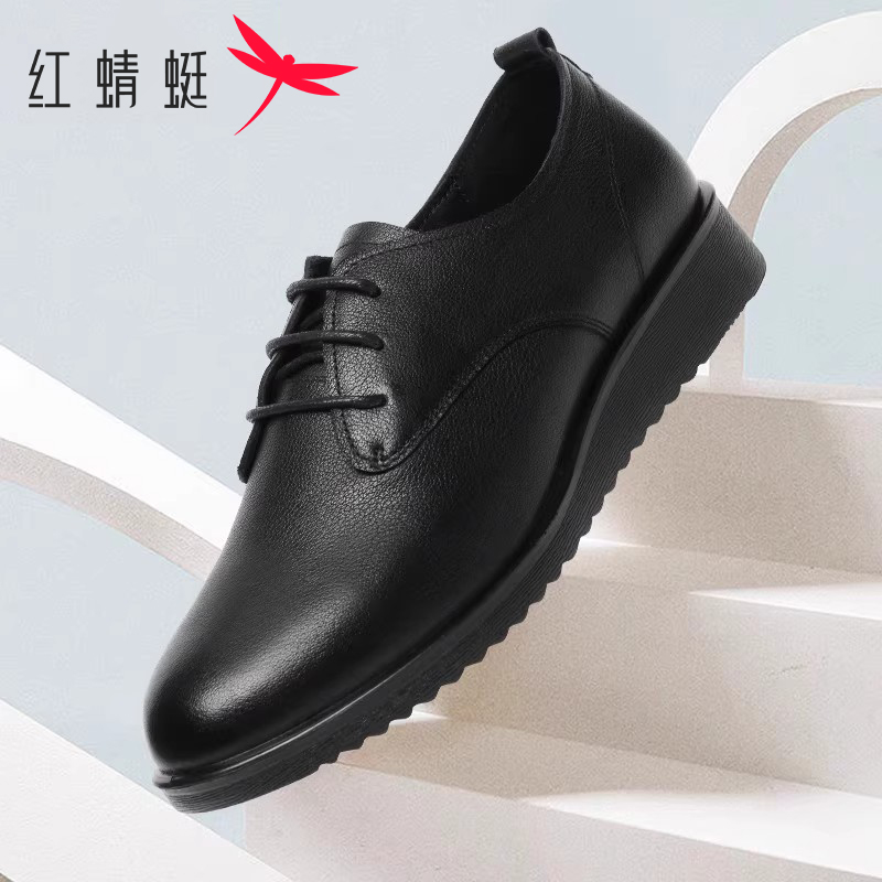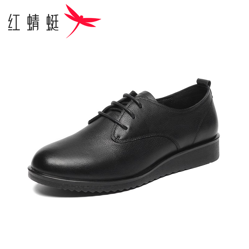 女士英伦小皮鞋 红蜻蜓女鞋 真皮透气中年妈妈鞋 防滑平底休闲鞋 秋季