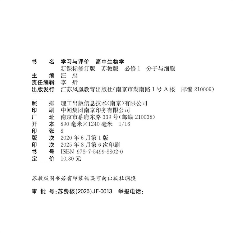 含答案 学习与评价 必修1 2025年 配苏教版 社 新课标修订版 江苏凤凰教育出版 高中生物学 苏教版 普通高中教科书 分子与细胞