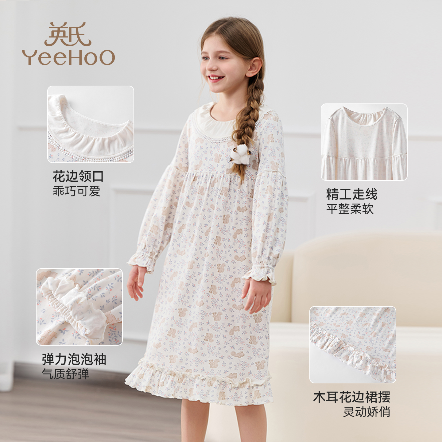 天丝居家碎花连衣裙中长款 新款 公主裙 长袖 英氏女童睡裙小女孩秋季