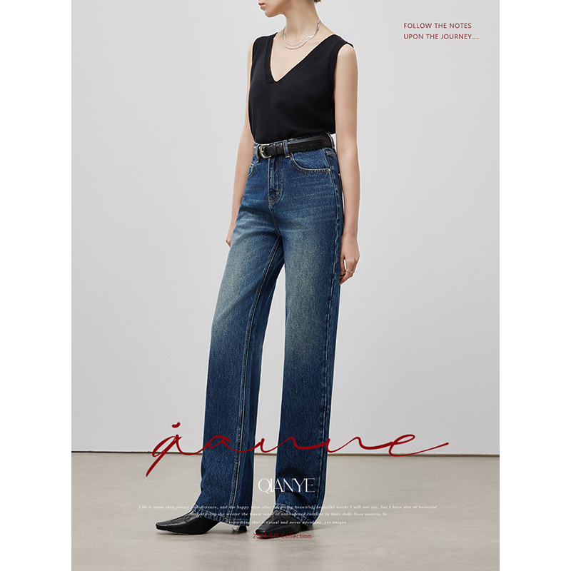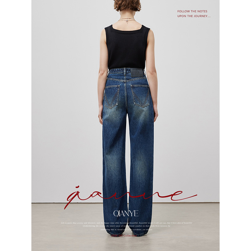 直筒拖地长裤 女春秋高端宽松时尚 2025年新款 深蓝色纯棉阔腿牛仔裤