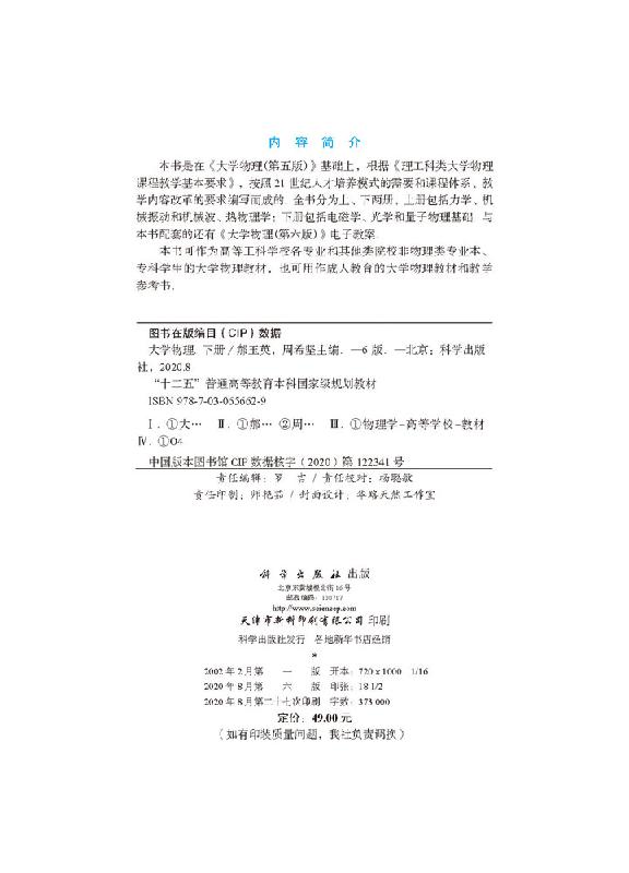 郝玉英 周希坚 罗吉 大学物理 社 下册 科学出版 9787030656629 第六版