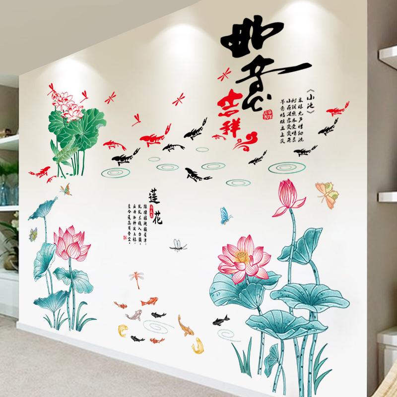 中国风荷花墙贴客厅沙发电视背景墙贴画卧室床头墙面装 饰贴纸自粘