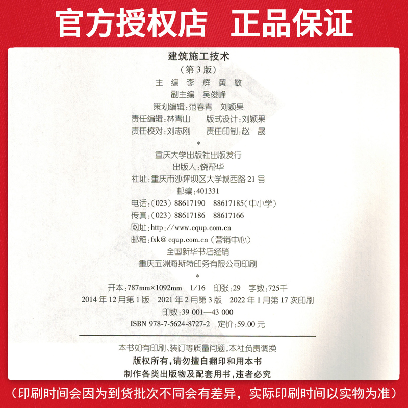 第3版 重庆大学出版 李辉 高等职业教育建筑工程技术专业系列教材 社 黄敏 建筑施工技术