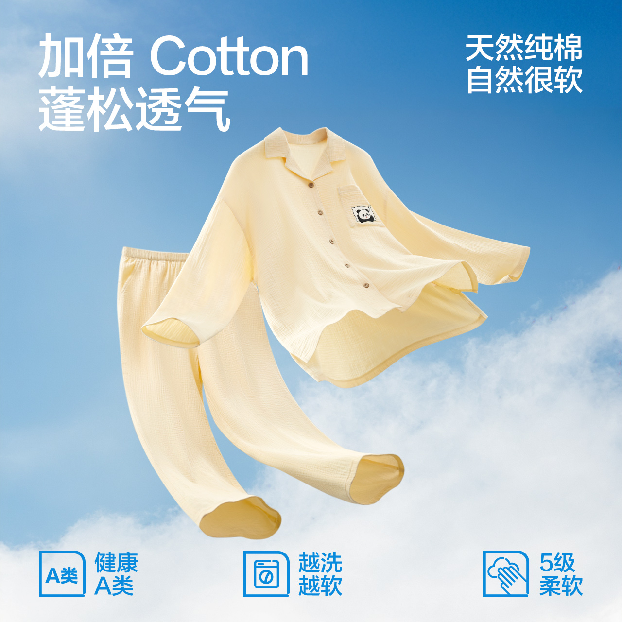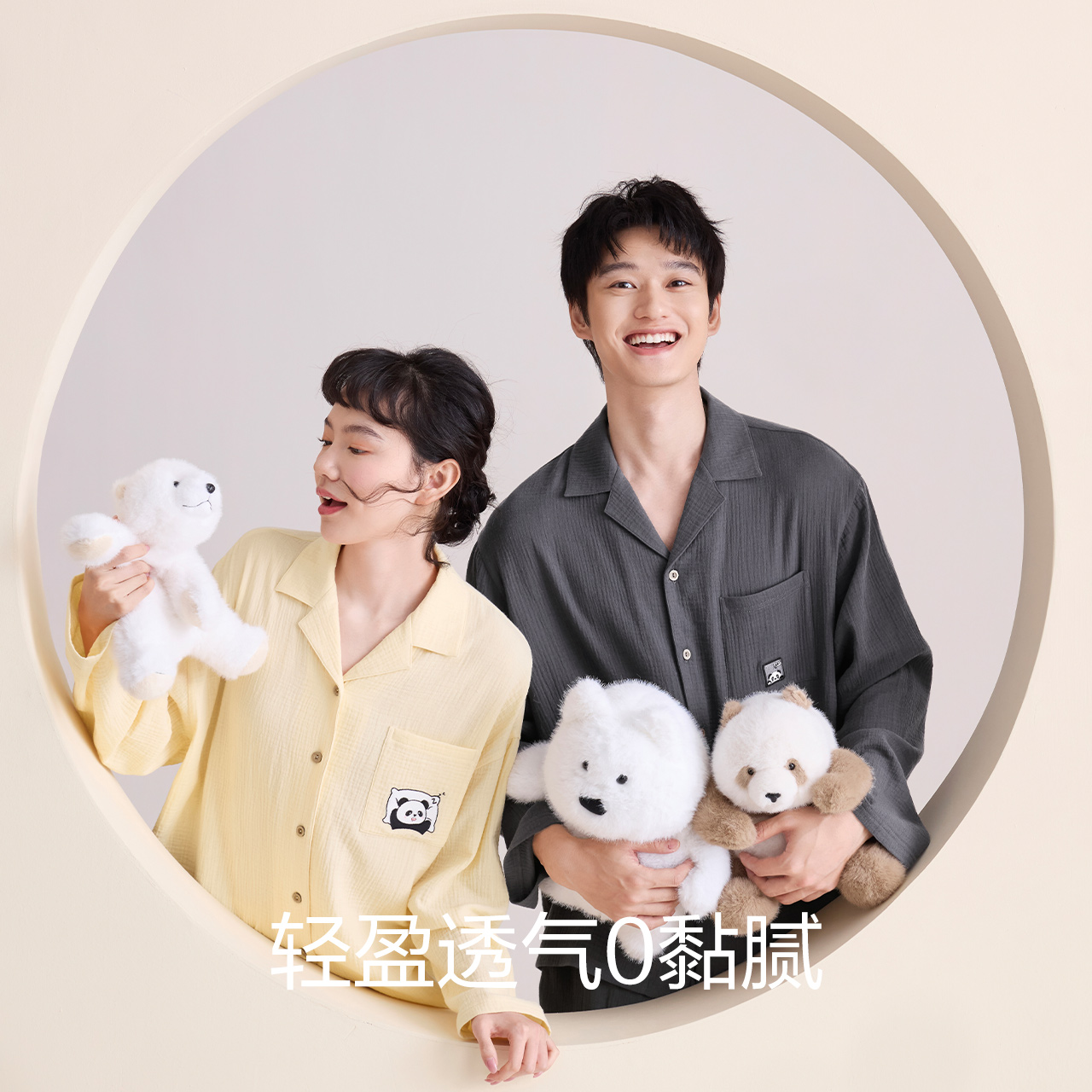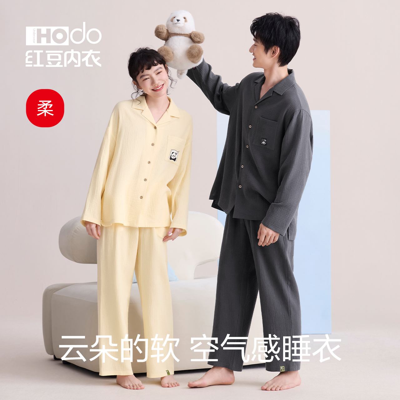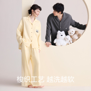 家居服套装 红豆纯棉睡衣女长袖 2025新款 A类泡芙纱男士 双层纱薄款