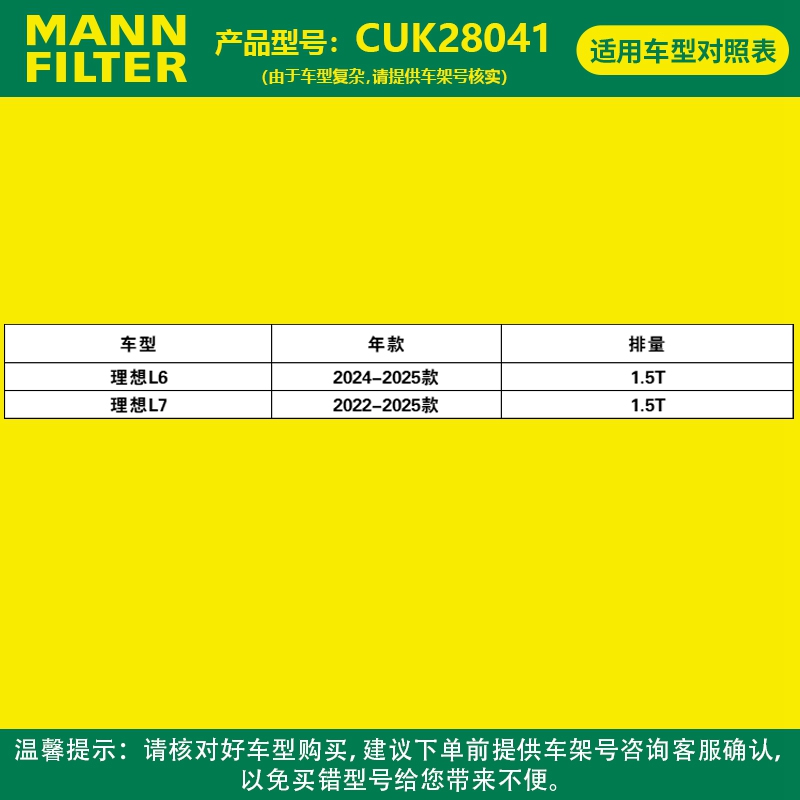 曼牌滤清器CUK28041空调滤芯格适用理想L6 排量1.5T