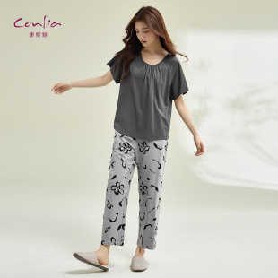 薄款 2025新款 短袖 套装 可外穿家居服 长裤 猫人纯棉带胸垫睡衣女夏季