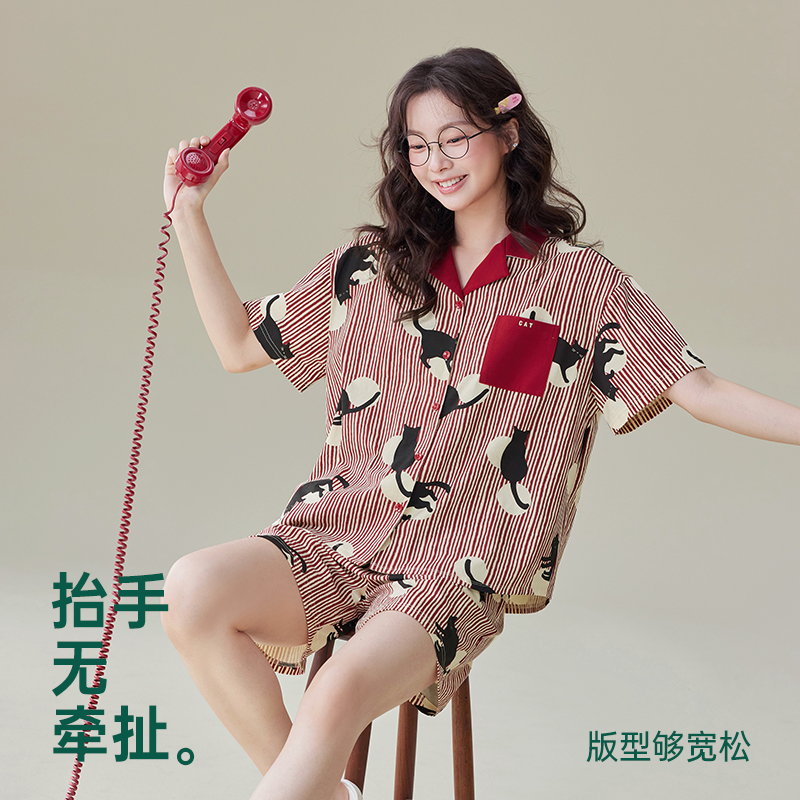 巨凉感 条纹家居服套装 纯棉睡衣女夏季 宽松大码 2025新款 安之伴
