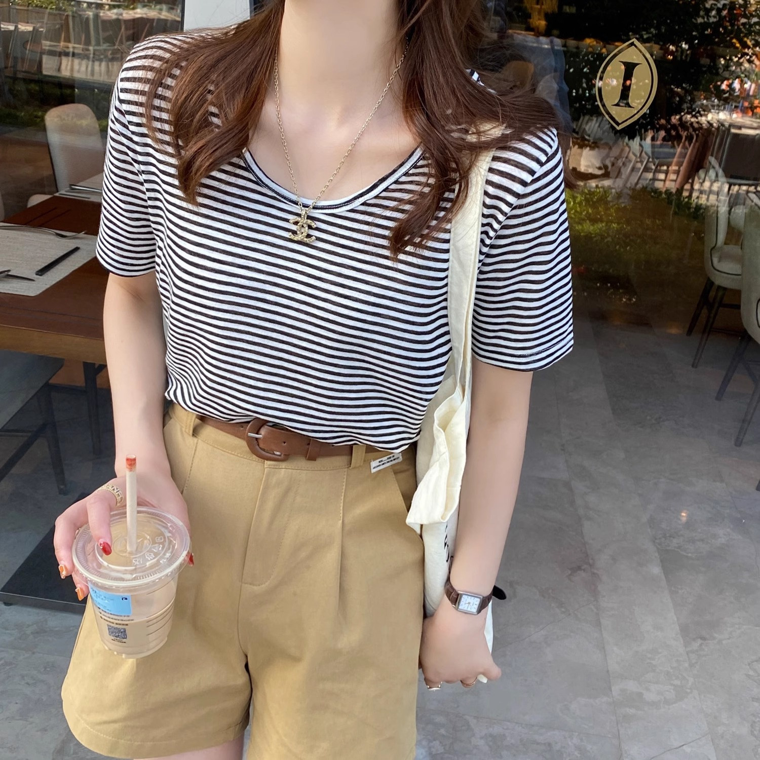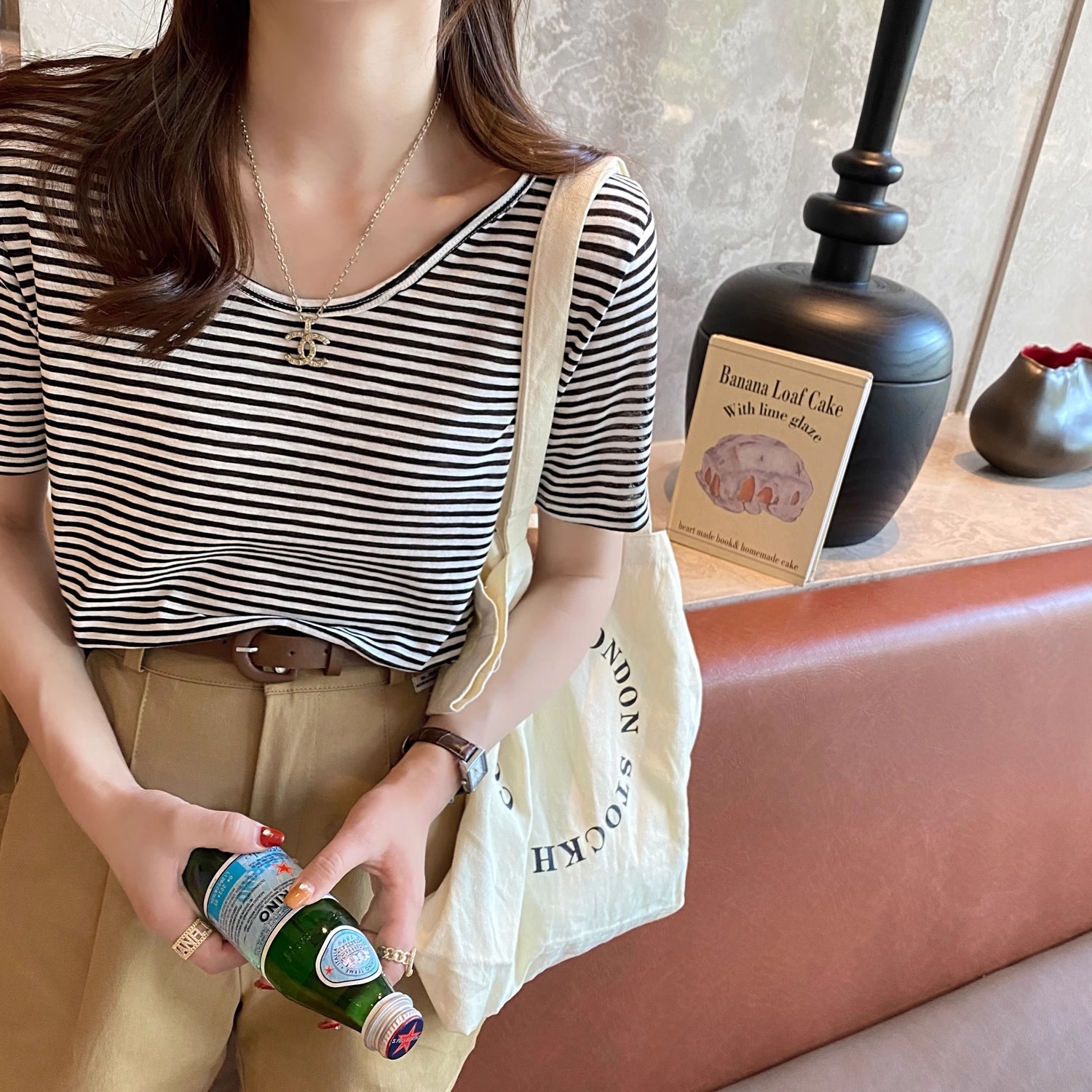 2025年新款 夏季 宽松冰丝小上衣 v领亚麻条纹t恤女短袖 拉夏贝尔薄款