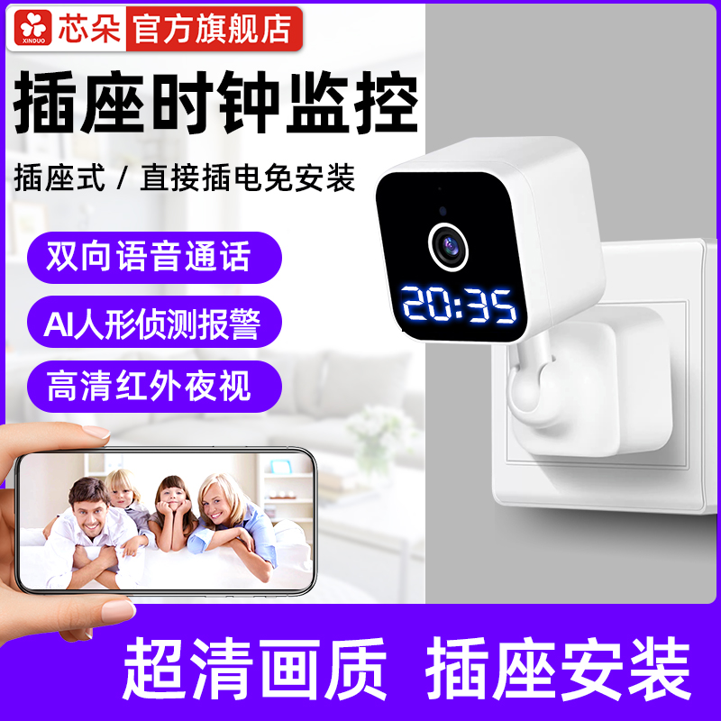插座式 WiFi时钟监控摄像头家用免布线手机远程高清夜视 无线免安装
