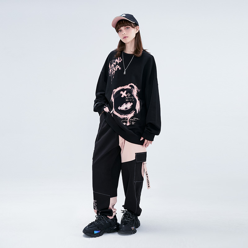 LAMLICKA卡通熊猫印花男圆领长袖 卫衣日系情侣休闲宽松套头上衣女