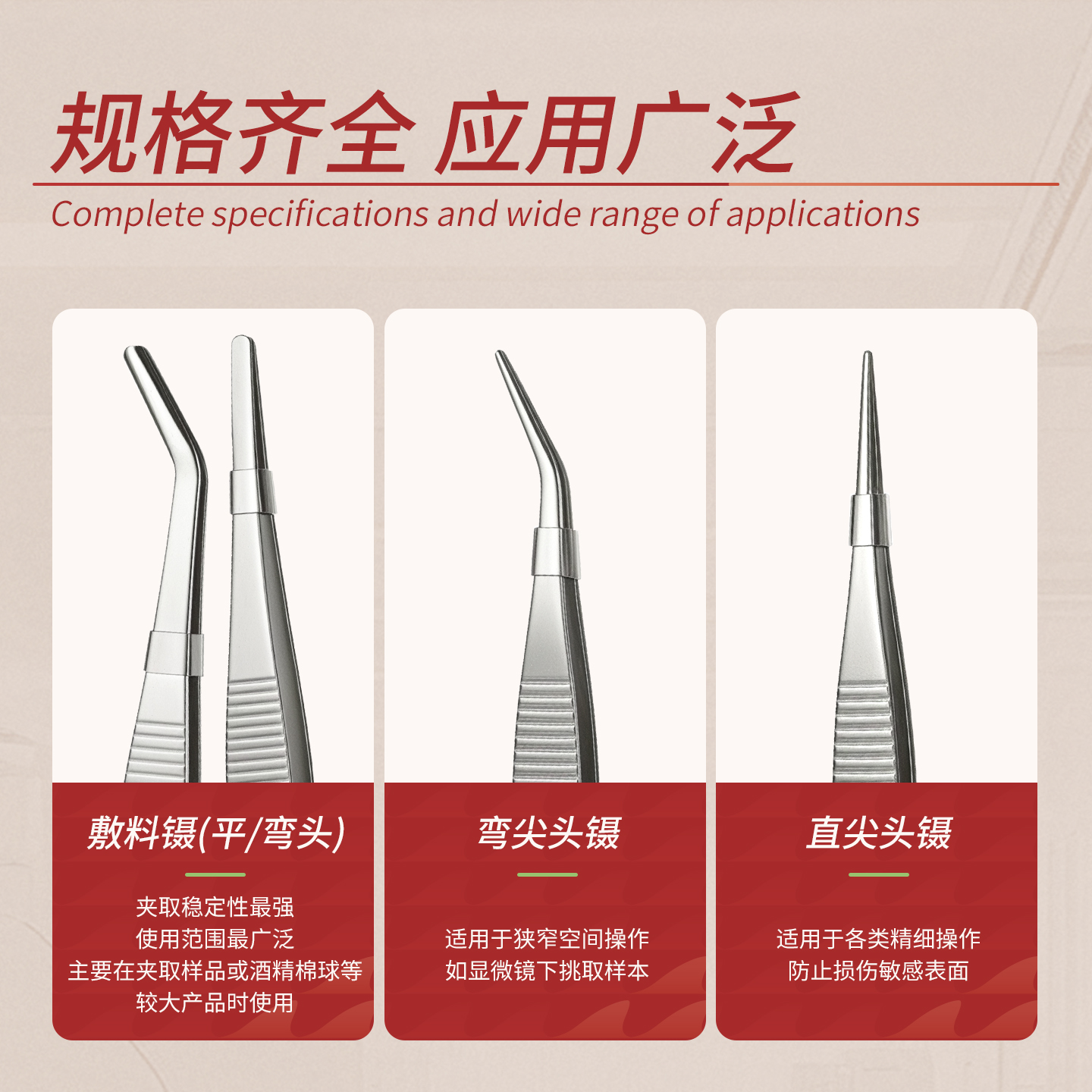 Labshark不锈钢镊子304加厚平头弯尖头夹子加长敷料镊组培实验室