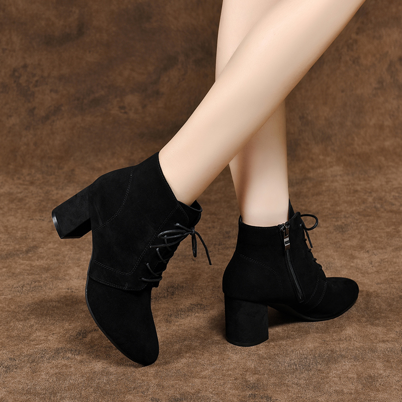女靴 秋冬软皮磨砂短靴气质中跟真皮鞋 2025新款 圆头系带粗跟高跟鞋