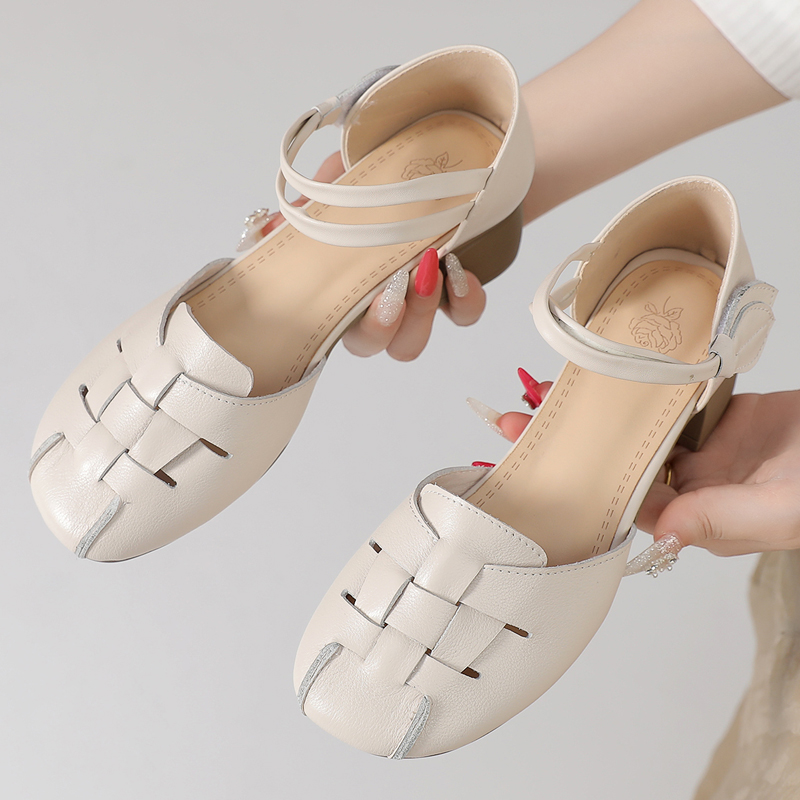 气质中空女鞋 包头凉鞋 粗跟软底中老年妈妈鞋 新款 女真皮2025年夏季