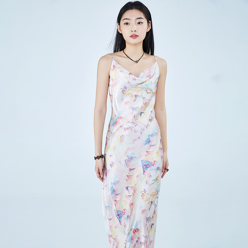 显瘦垂坠感气质吊带V领连衣裙夏季 裂帛设计师款 梦幻印花修身