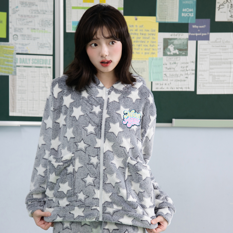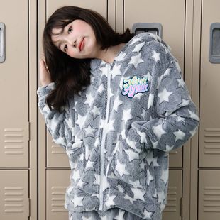 保暖加绒加厚可外穿 女睡衣家居服星星连帽套装 V&K2024秋冬季 新款