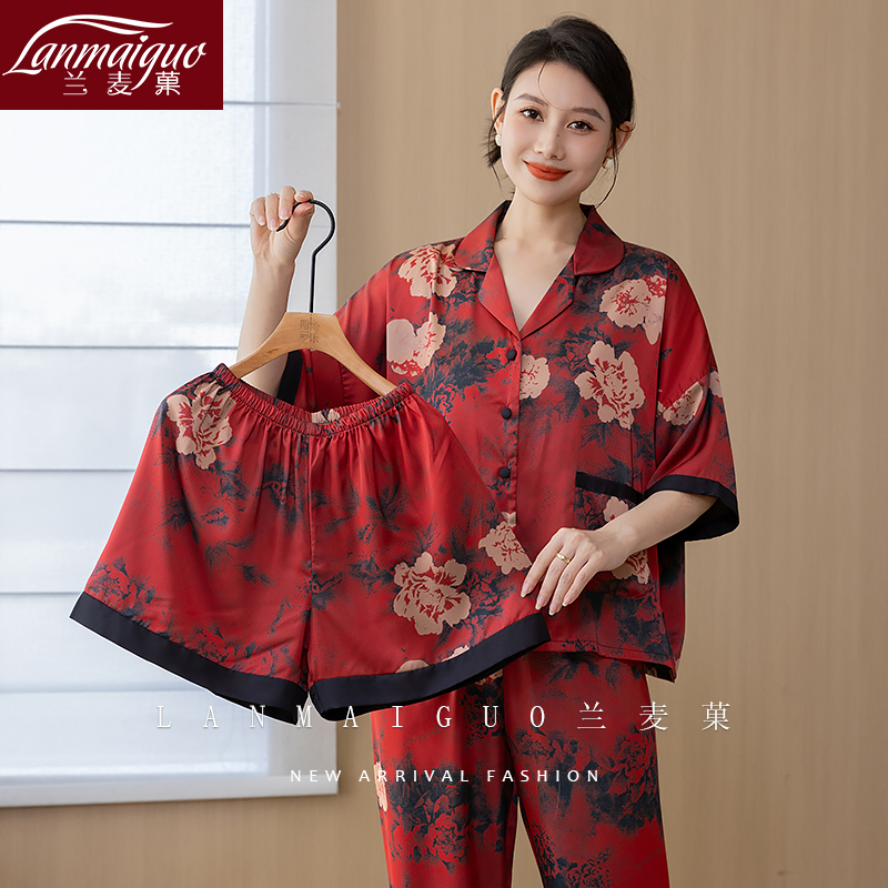 仿真丝绸家居服可外穿三件套 短袖 兰麦菓夏季 睡衣女士冰丝2025薄款