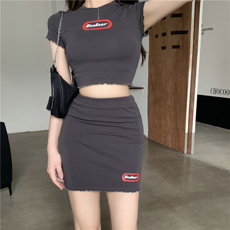 修身 T恤上衣 显瘦高腰包臀裙短裙两件套 女夏辣妹字母短袖 性感套装