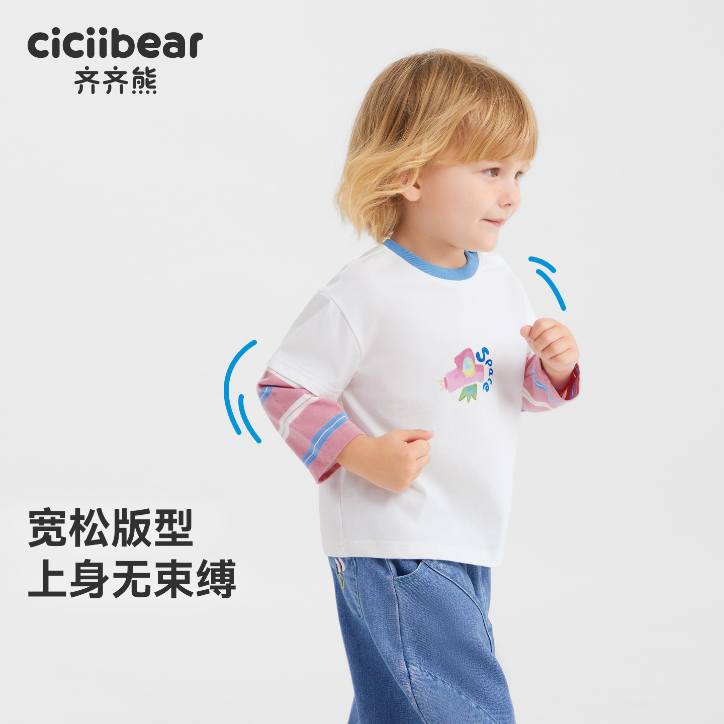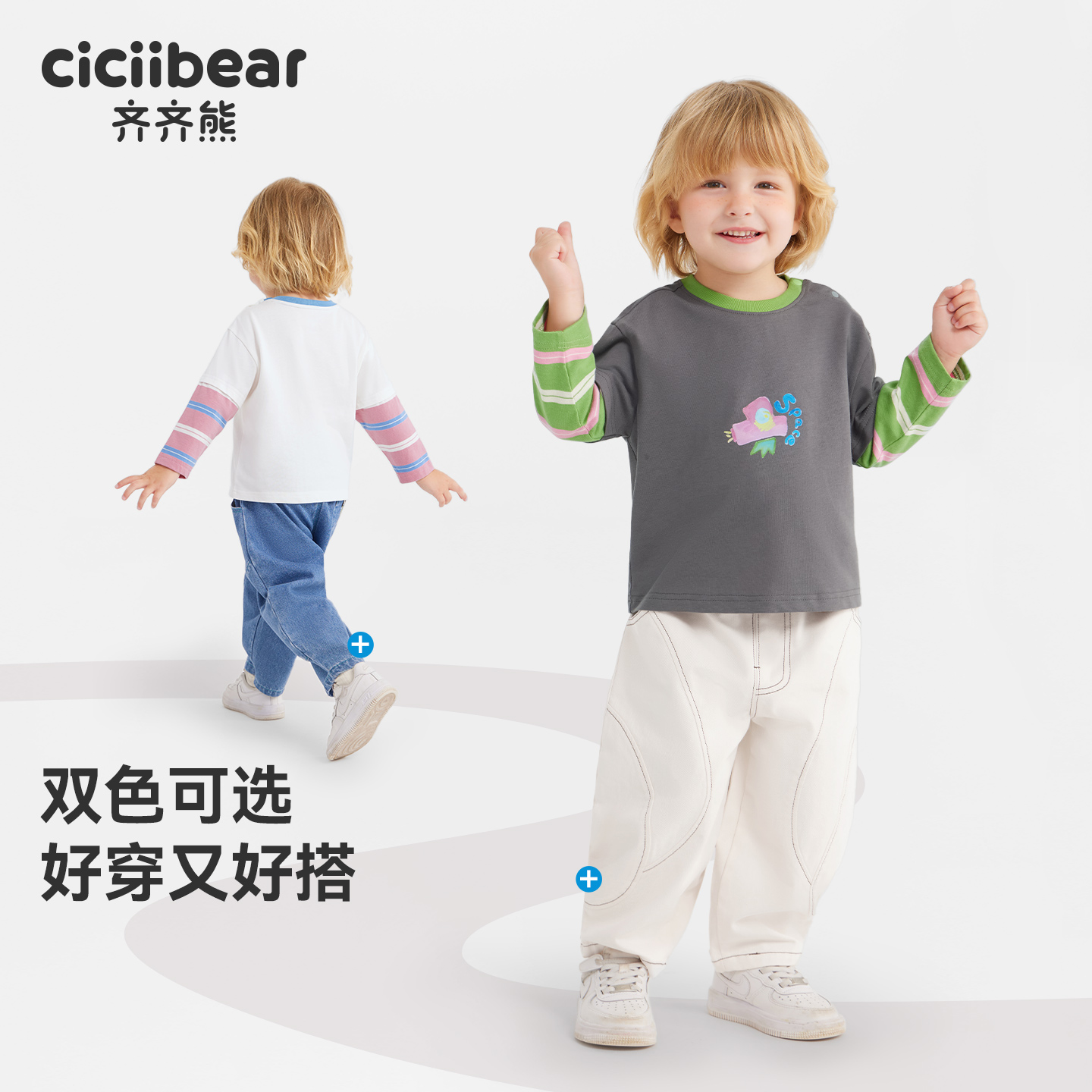 打底衫 齐齐熊宝宝T恤春秋男童长袖 儿童假两件t秋装 100%纯棉抗菌
